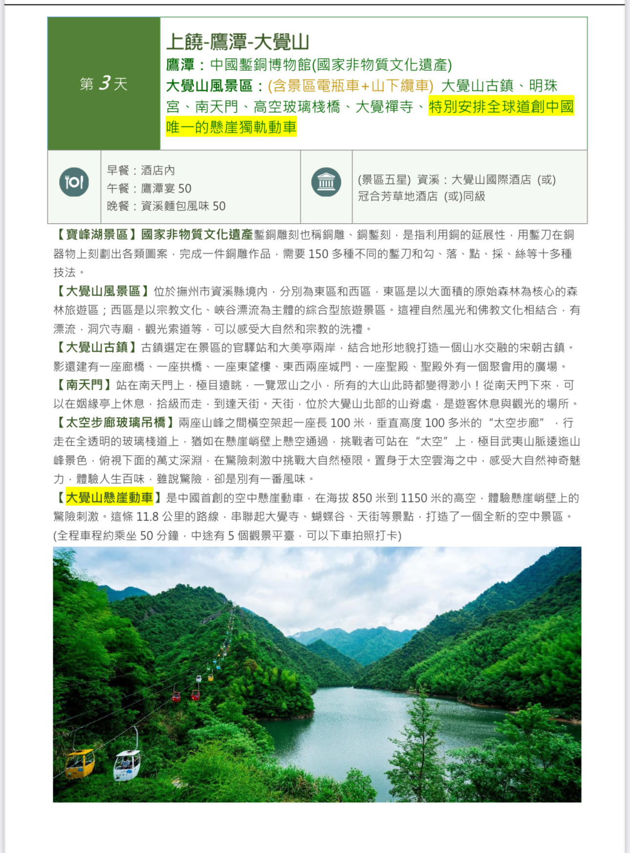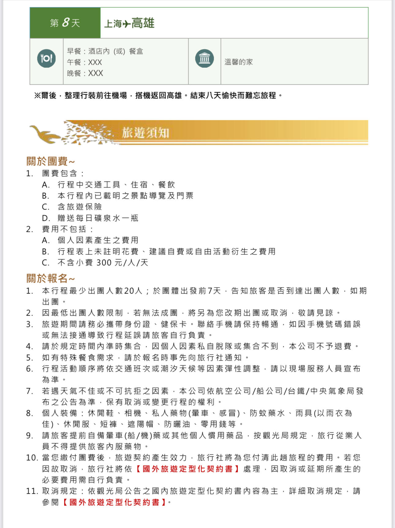3. 行程如遇觀光景點休假及住宿飯店地點調整或遇不可抗拒之現象(天候不佳),本公司保有變更行程之權利。