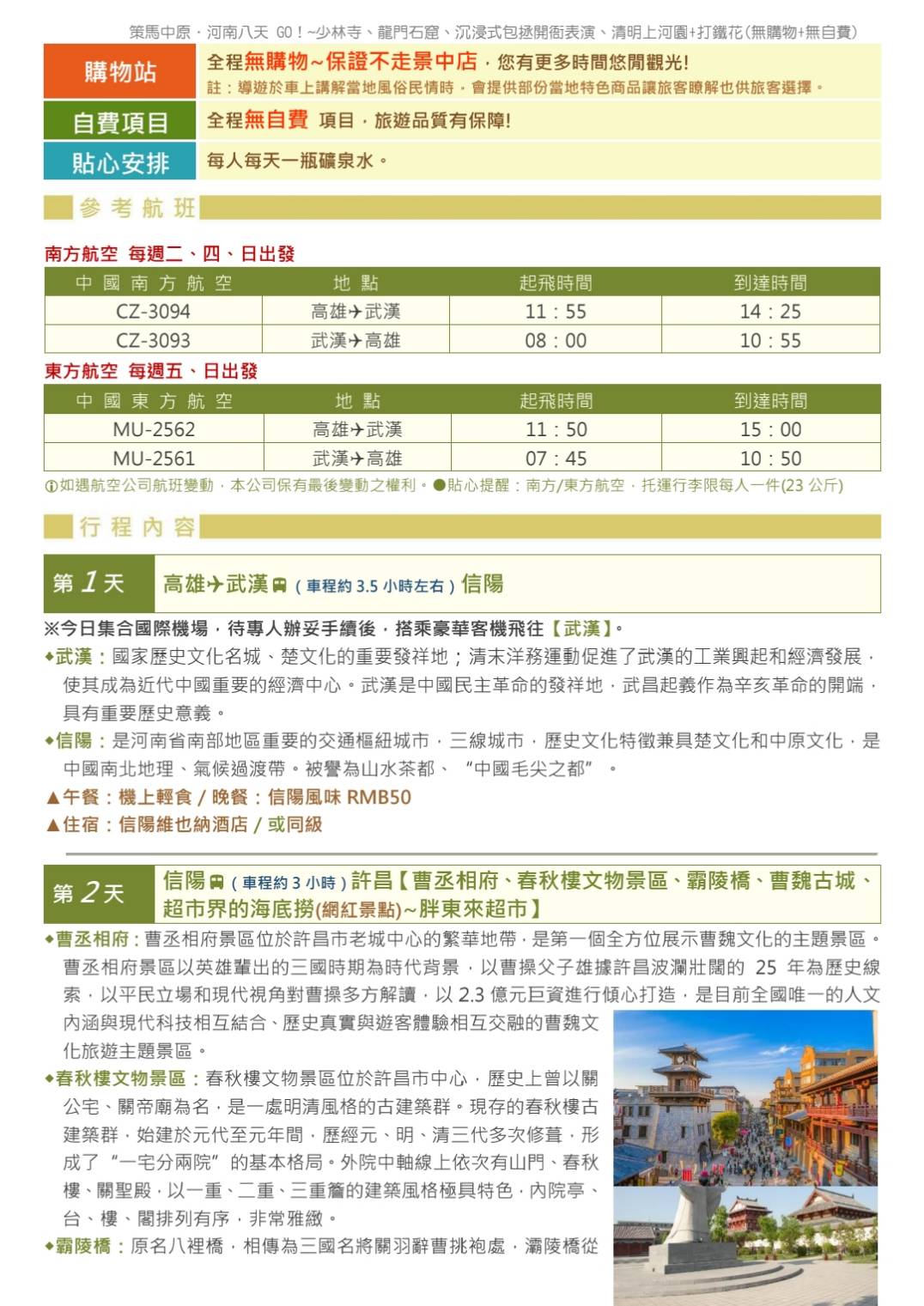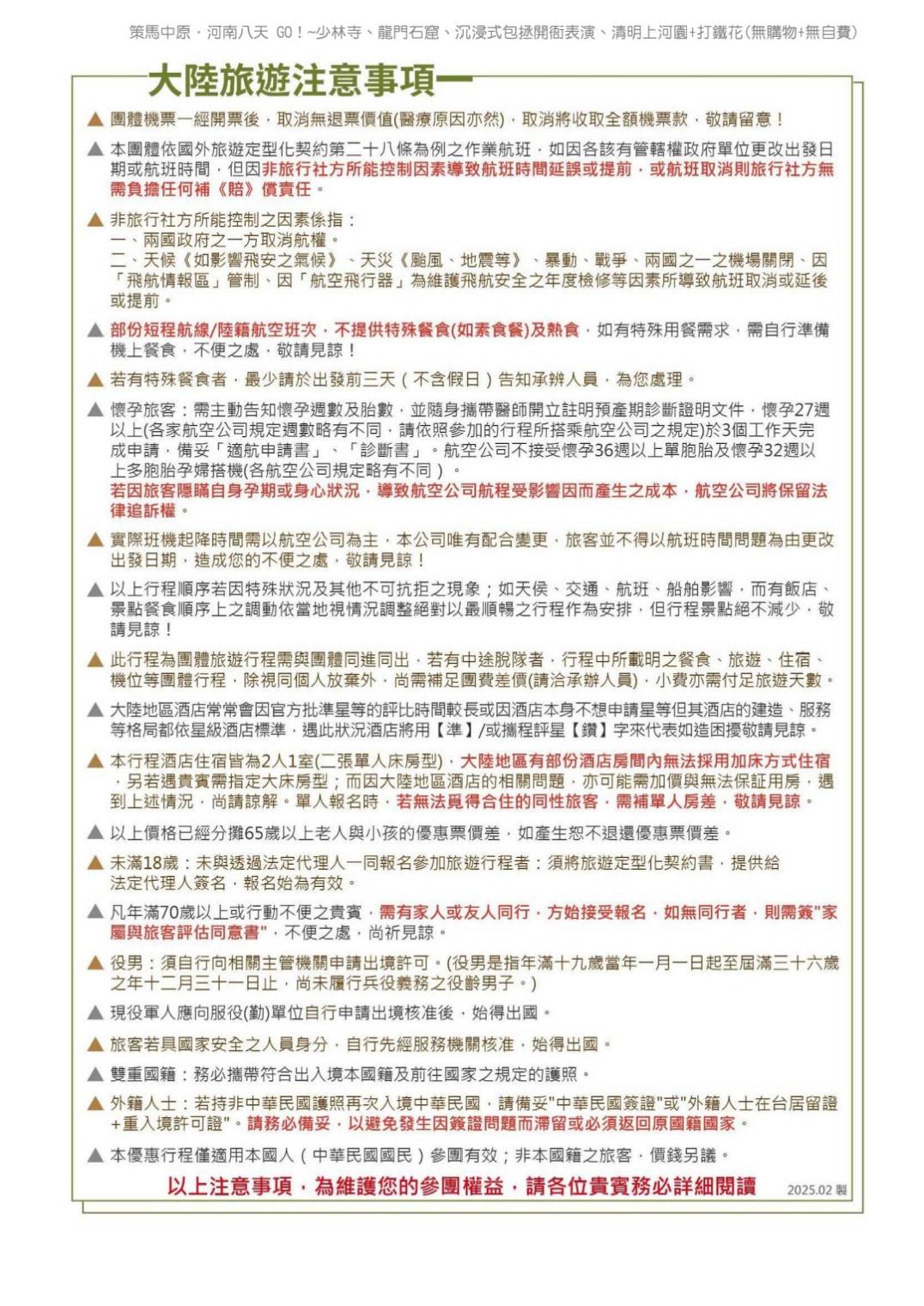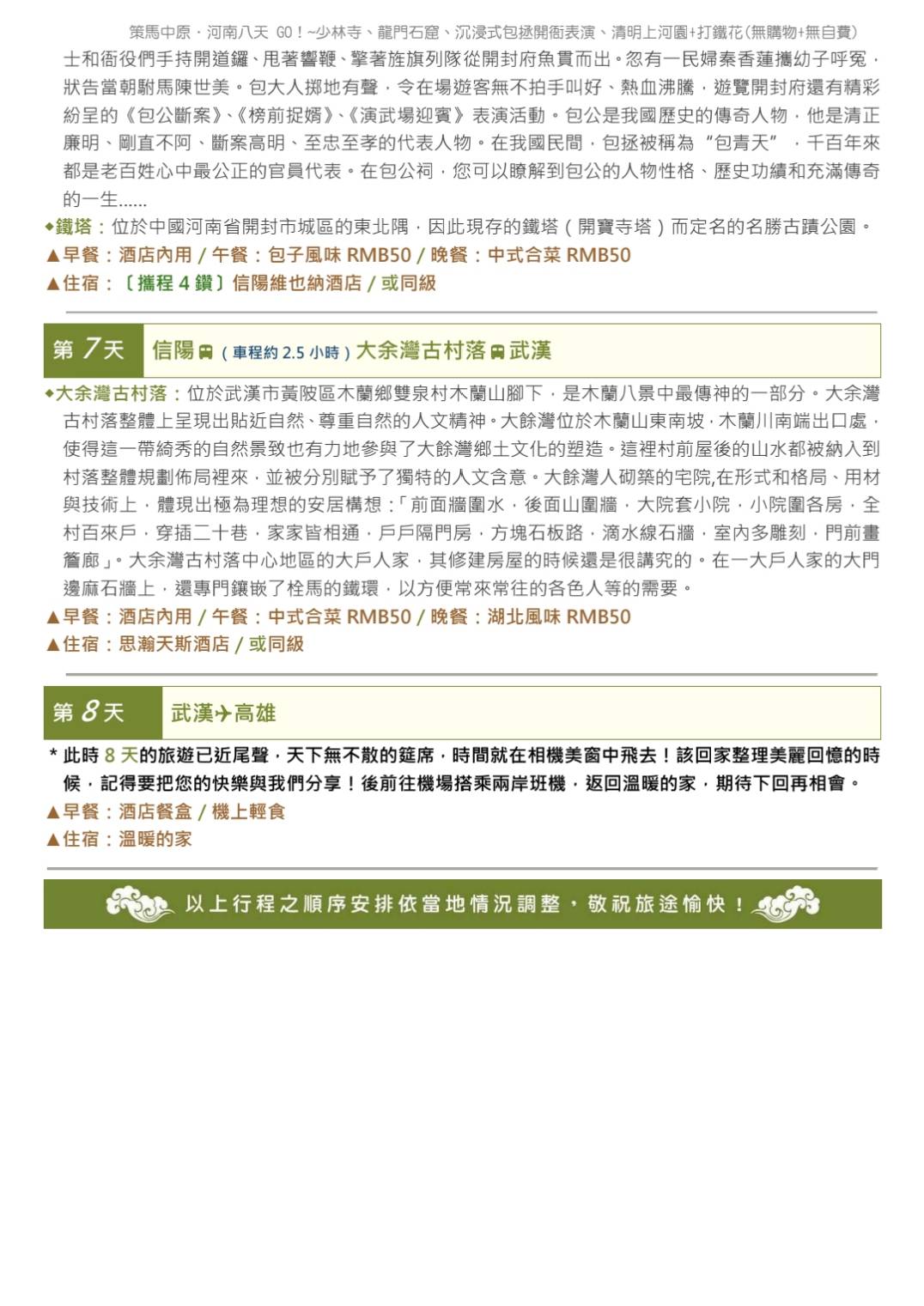 3. 行程如遇觀光景點休假及住宿飯店地點調整或遇不可抗拒之現象(天候不佳),本公司保有變更行程之權利。