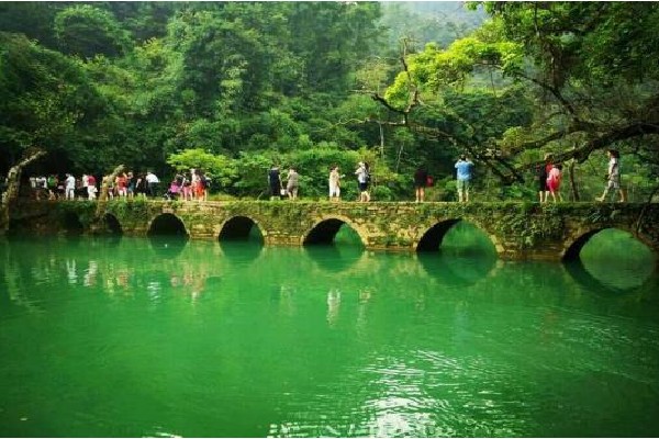 【小七孔風景區】荔波小七孔位於布依族、瑤族居住的王蒙鄉,貴州荔波縣西南部,距荔波縣城28公里,因其北首有一座建於道光十五(1836)年的小七孔古橋,故小七孔之名由此而來;景區在寬僅一公里、長十二公里的狹長幽谷裏,集洞、林、湖、瀑、石、水多種景觀於一體,玲瓏秀麗,令遊客耳目常新,有「超級盆景」的美譽,現已經向遊客開放的景點有銅鼓橋、小七孔古橋、涵碧潭、拉雅瀑布、68級跌水瀑布、野鴨池、龜背山、一龍戲九珠、飛雲洞、野豬林、水上森林、天鐘洞、臥龍潭、臥龍河生態長廊漂遊等。