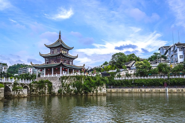 【鎮遠】位於貴州東部,舞陽河下遊,因舞陽河以倒「S」形流經小城,而被視為「太極古城」,有西南水鄉之稱,鎮遠縣處在這個凸凹結合部上。這裡群山聳翠,諸水流青。古老而美麗的舞陽河像"太極圖"旋繞在府衛兩城中間,兩座大石拱橋像兩條紐帶橫架河上,連結兩城。有「南方絲綢之路」要津之美稱。