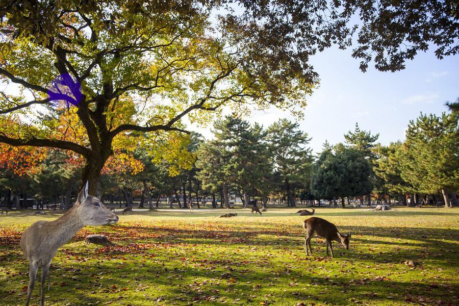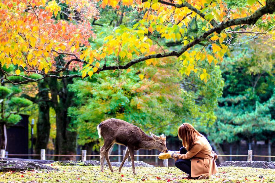 奈良市東部的奈良公園是一所東西約4公里、南北約2公里的公園,園內寬闊的草甸上有許多小鹿在嬉戲玩耍,園內還有東大寺、興福寺、春日大社等奈良代表性的寺廟。潺潺流水、池塘和小溪爲公園的景色增添了色彩,樹林中隱約可望見寺廟的大屋頂和塔樓。公園中一年四季景色優美如畫,終年觀光遊客絡繹不絕。