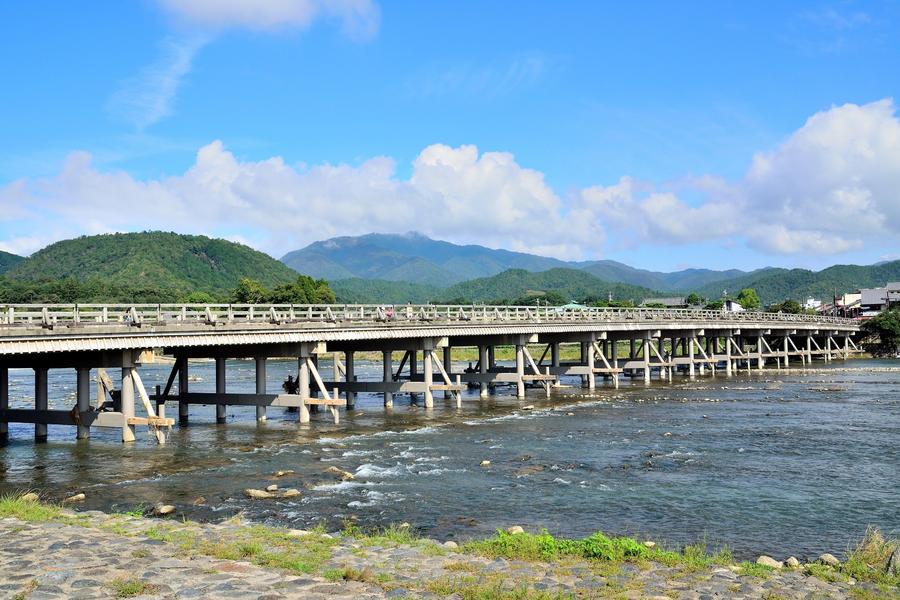 渡月橋別名嵐橋,橫跨在京都嵐山的大堰川上,全長155公尺,據說是空海的弟子道昌於日本平安時代初期整修大堰川時所建。四百數十年後,龜山上皇在某個沒有雲朵的夜晚,看到月亮在橋的正上方緩緩的由一邊移動到另外一邊,猶如渡橋因而得名。以渡月橋為分界,上流稱為大堰川,下流則稱桂川,是昔日平安都城的貴族們乘舟戲水、欣賞楓葉的熱門景點,細緻優雅的水流至今不斷,風景秀麗,成為代表京都的明媚景色,吸引許多旅客造訪。