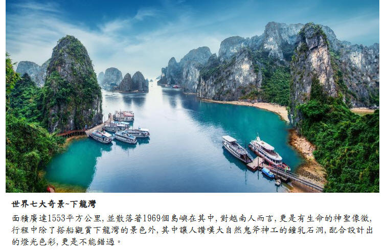 【食】早餐:飯店早餐午餐:遊輪享用自助午餐(若當日旅客低於30人,船公司將提供個人精緻套餐為主)晚餐:下龍灣海鮮火鍋風味餐USD15