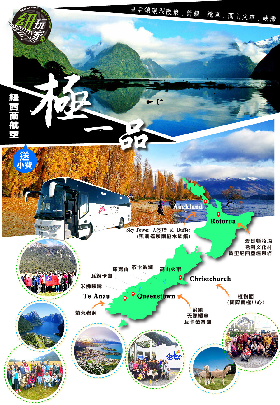 • 行程:紐西蘭當地如遇洪水、大雪、雷雨等氣候因素,導致行程受影響,基於旅客生命安全以及團體操作順利之考量,公司將以旅客之最大利益前提下,機動性調整行程。期間所產生之費用差,將予以退費,敬請諒解。
