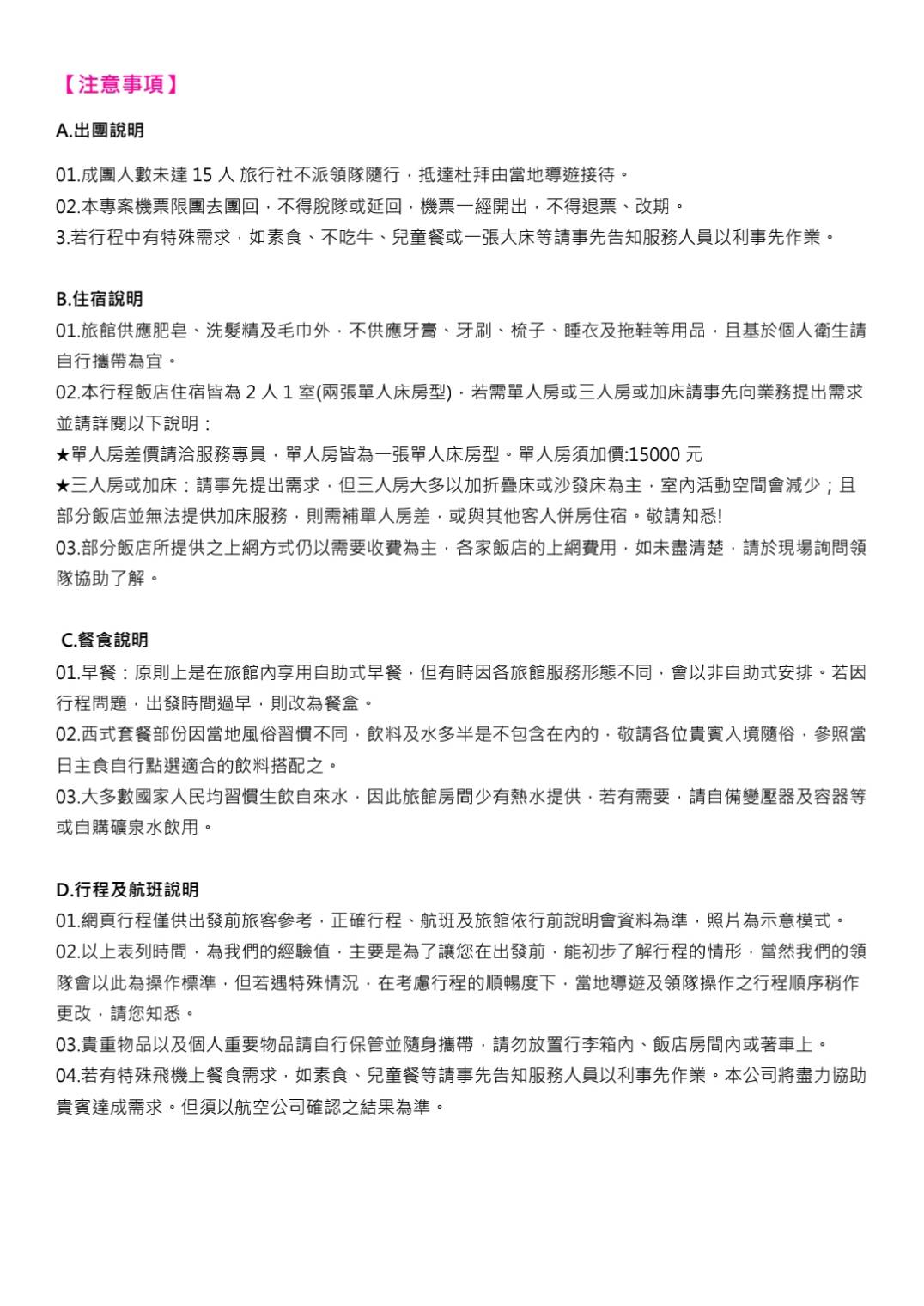 行程如遇觀光景點休假及住宿飯店地點調整或遇不可抗拒之現象(天候不佳),本公司保有變更行程之權利。