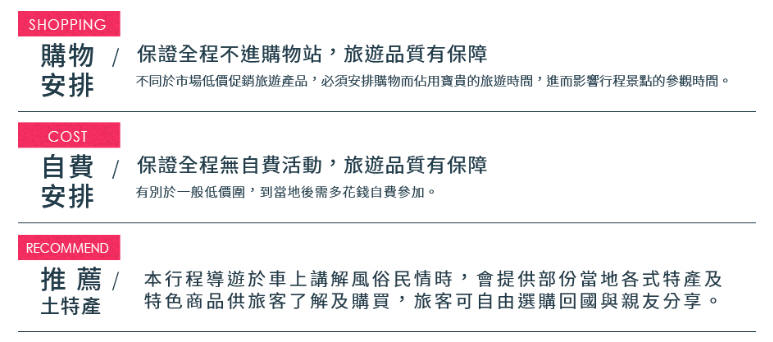 4.導遊於車上進行風俗文化介紹時,將適度展示當地特色商品供旅客參考與了解,並提供購買選擇,絕無強迫推銷,請安心選擇。