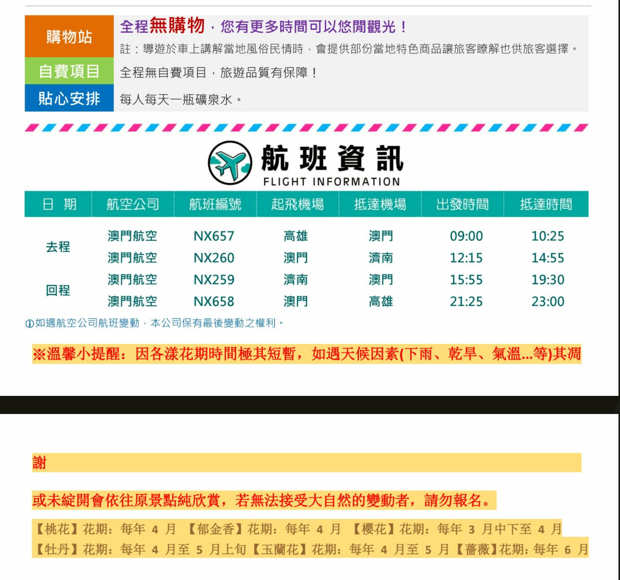 3. 行程如遇觀光景點休假及住宿飯店地點調整或遇不可抗拒之現象(天候不佳),本公司保有變更行程之權利。