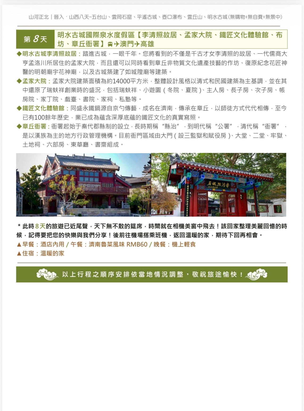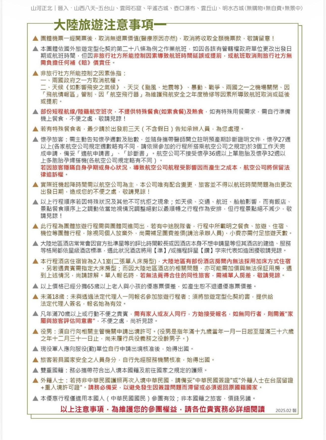 3. 行程如遇觀光景點休假及住宿飯店地點調整或遇不可抗拒之現象(天候不佳),本公司保有變更行程之權利。
