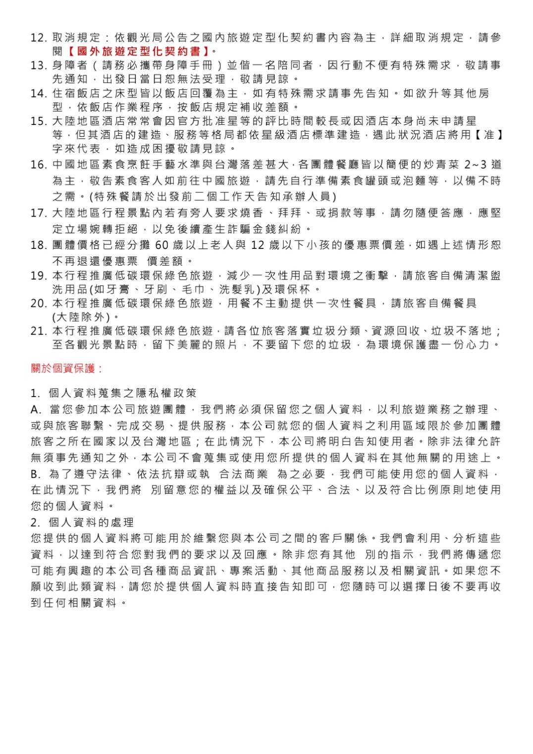 行程如遇觀光景點休假及住宿飯店地點調整或遇不可抗拒之現象(天候不佳),本公司保有變更行程之權利。