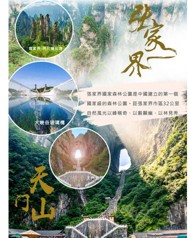 (迷魂臺、天下第一橋…)、天子山景區(西海石林、御筆峰、仙女散花、石船出海等景點,天子山索道下山)