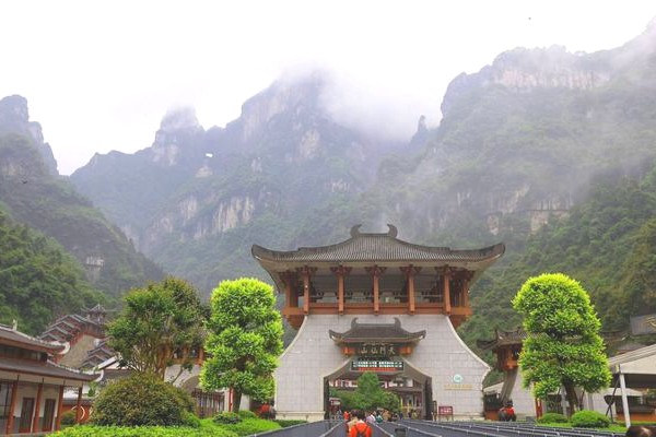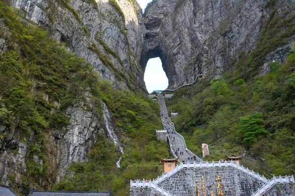 【天門洞】可謂世界上最高海拔的天然穿山溶洞門高131公尺、寬 57公尺、深 60公尺。南北對開於千尋素壁之上,氣勢磅礡,仙山巍峨高絕,更是盡顯造化神奇的冠世奇觀。 1999 年世界特技飛行大師曾架機穿越天門洞,引起世人關注。天門山寺,自明朝以來就香火鼎盛,是湘西的佛教中心。