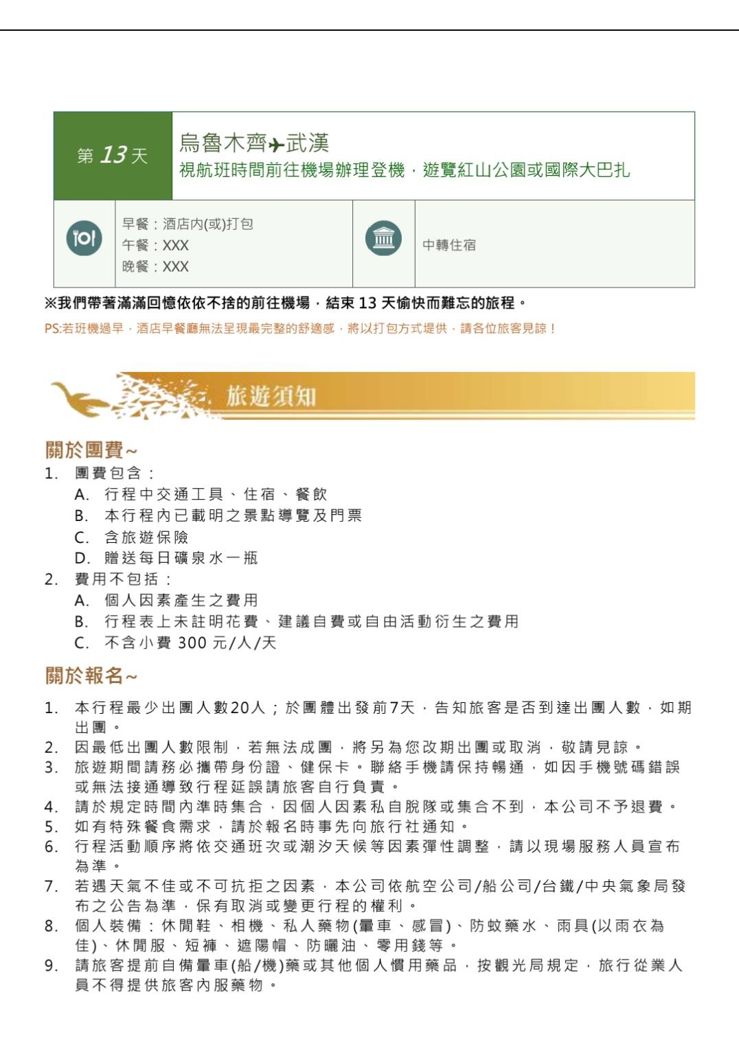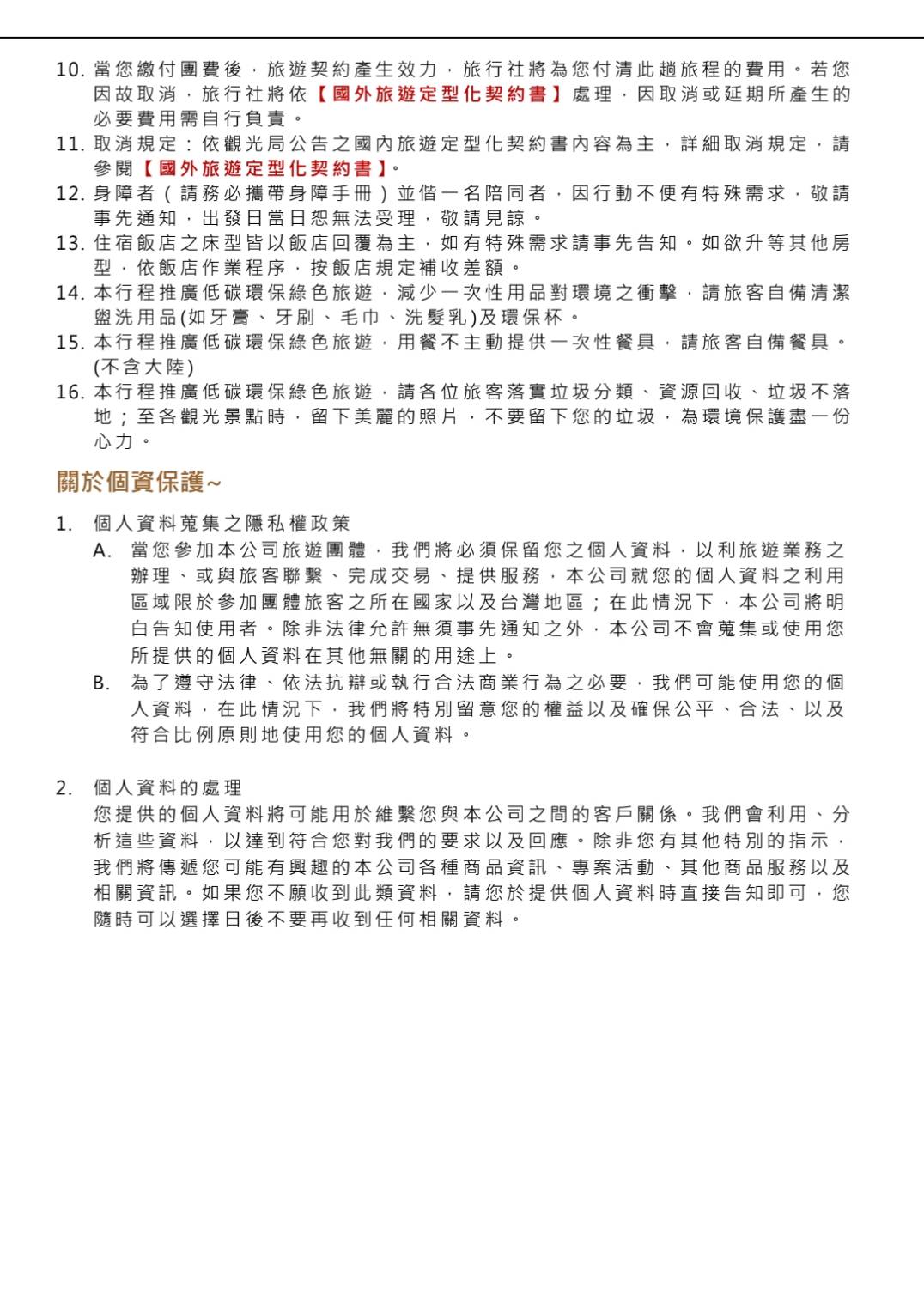 行程如遇觀光景點休假及住宿飯店地點調整或遇不可抗拒之現象(天候不佳),本公司保有變更行程之權利。