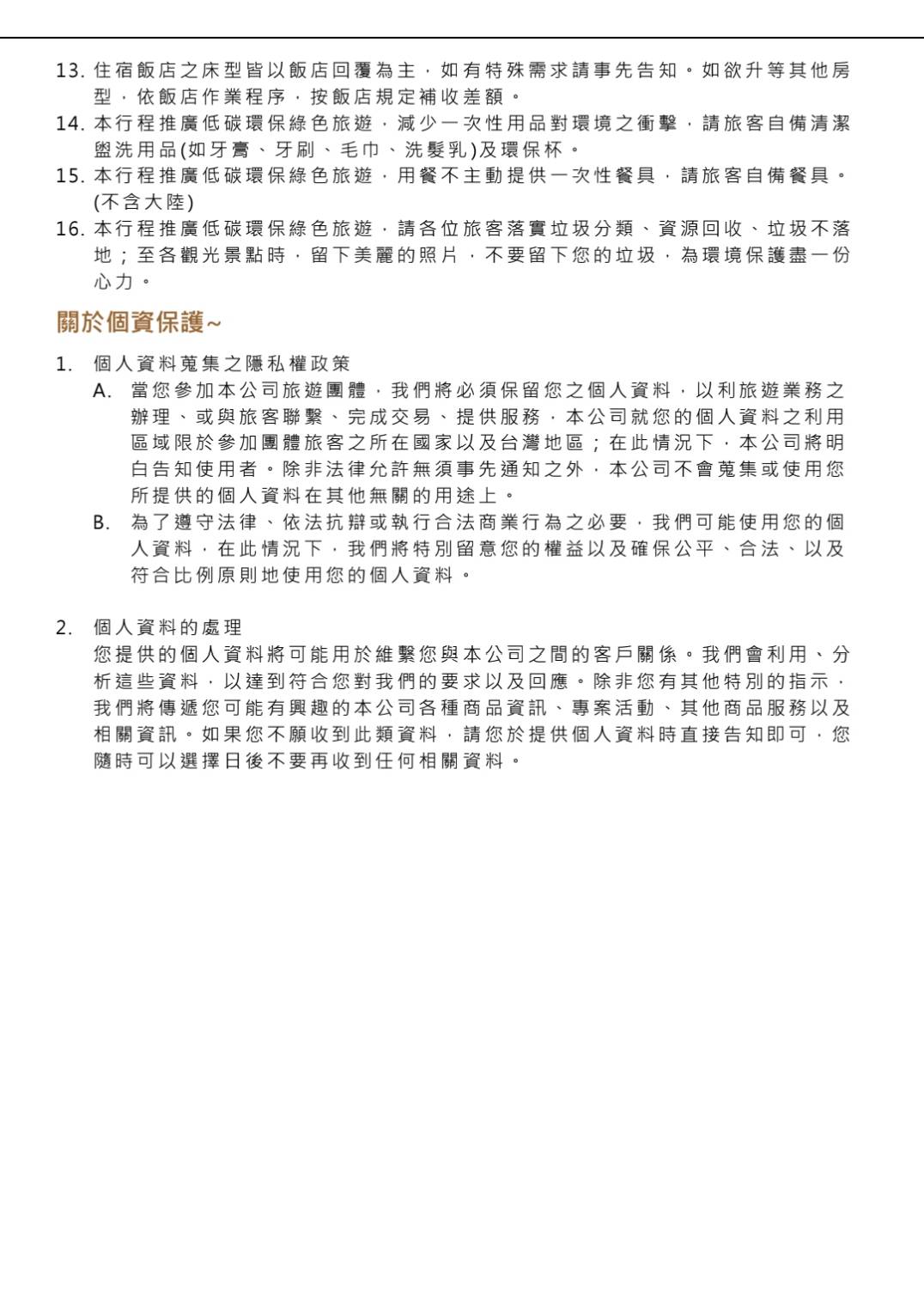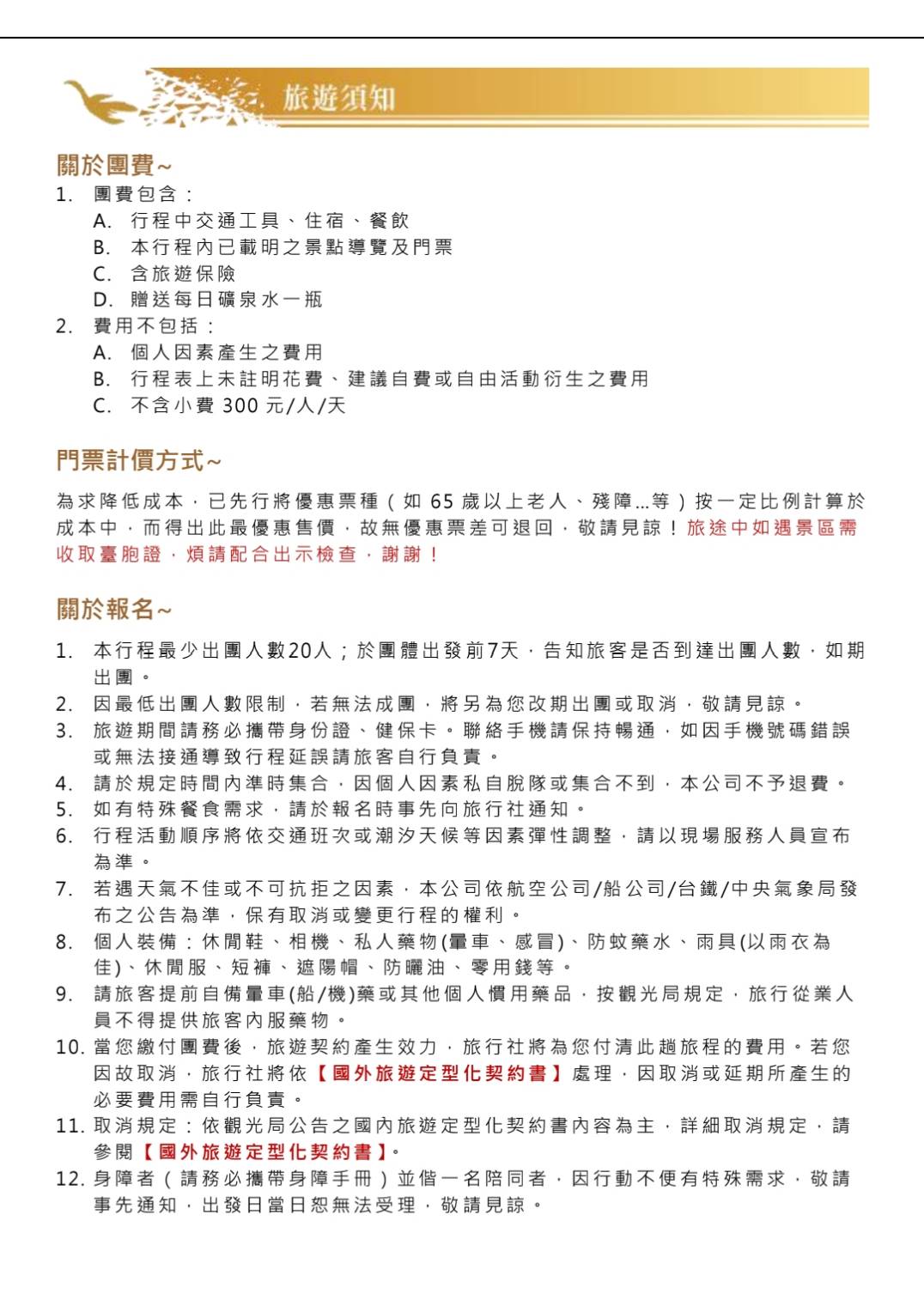 行程如遇觀光景點休假及住宿飯店地點調整或遇不可抗拒之現象(天候不佳),本公司保有變更行程之權利。