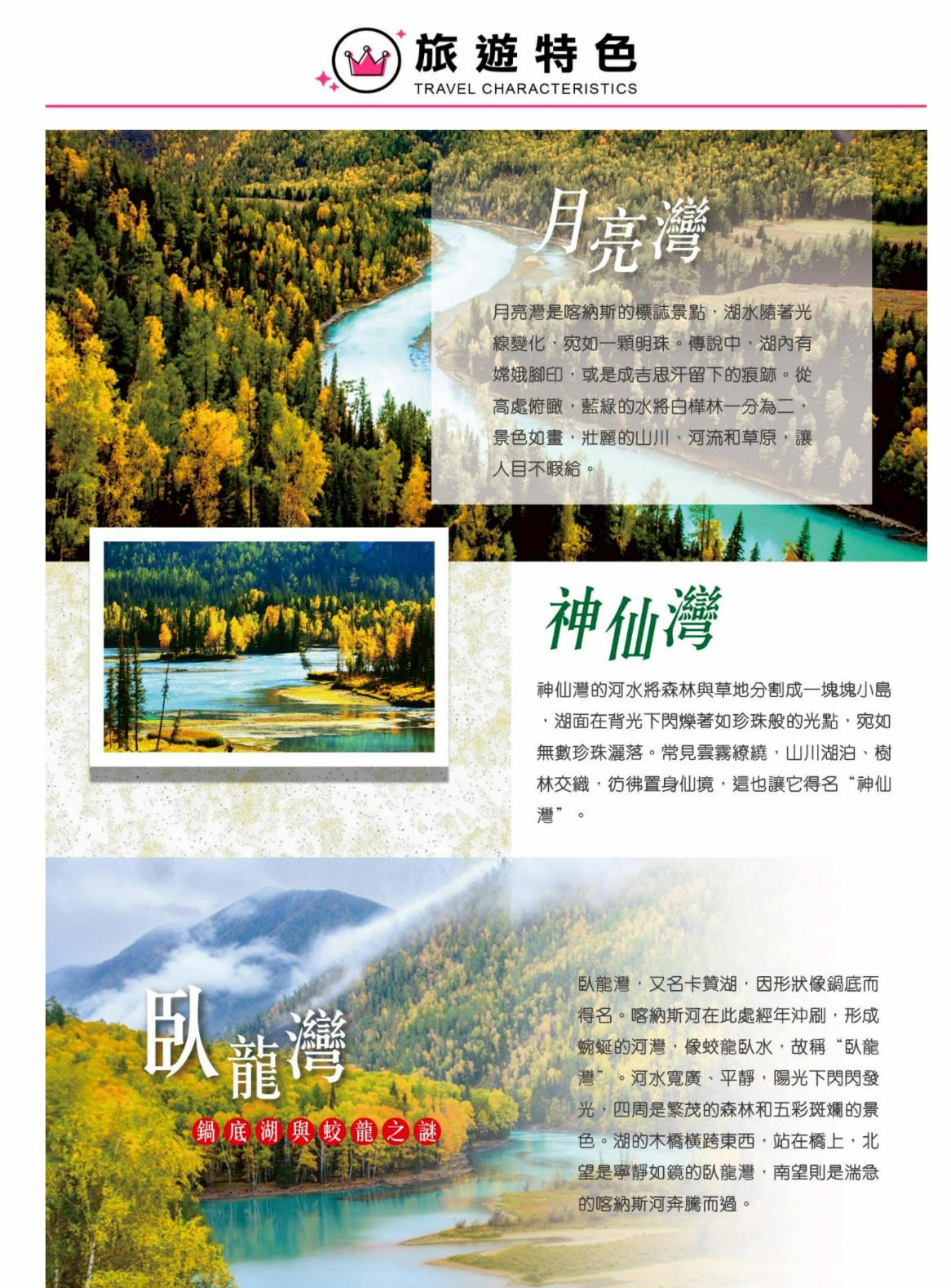 從臥龍灣沿喀納斯河北上約1公里,你會在峽穀中看到一藍色月牙形湖灣,那就是月亮灣。月亮灣會隨喀納斯湖水變化而變化,是鑲在喀納斯河的一顆明珠。湖內有嫦娥奔月時留下的一對光腳印。也有傳說這個腳印是當年成吉思汗追擊敵人時留下的。美麗靜謐的月亮灣是喀納斯的標誌景點。「月亮灣」因斯河河段曲流彷如一彎明月而得名,從高處向下俯瞰,藍綠色的河水將一望無際,將連綿而成的白樺林一分為二,其間線條分,明煞是好看。沿途觀“金山”─阿爾泰山的雄偉與秀麗,“銀水”─額爾齊斯河(中國唯一流入)的自然風光,水草豐美、牛羊成群、哈薩克氈房如繁星點點落在無垠的草原上,景緻如畫,美不勝收。
