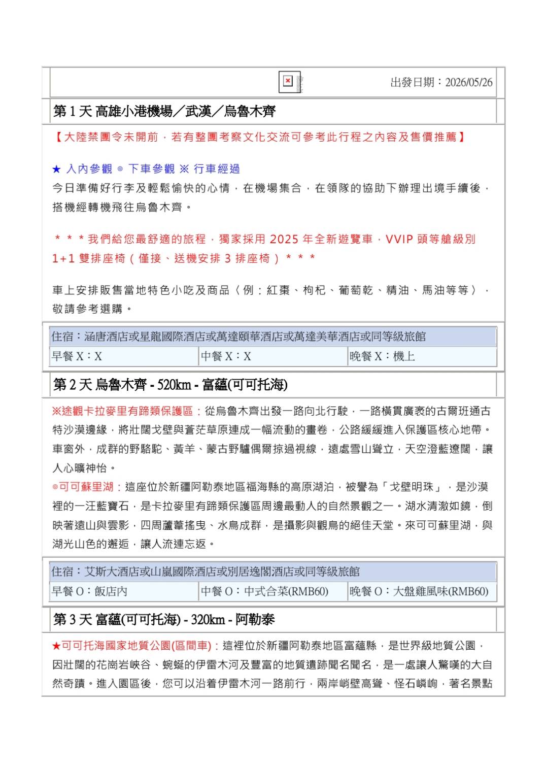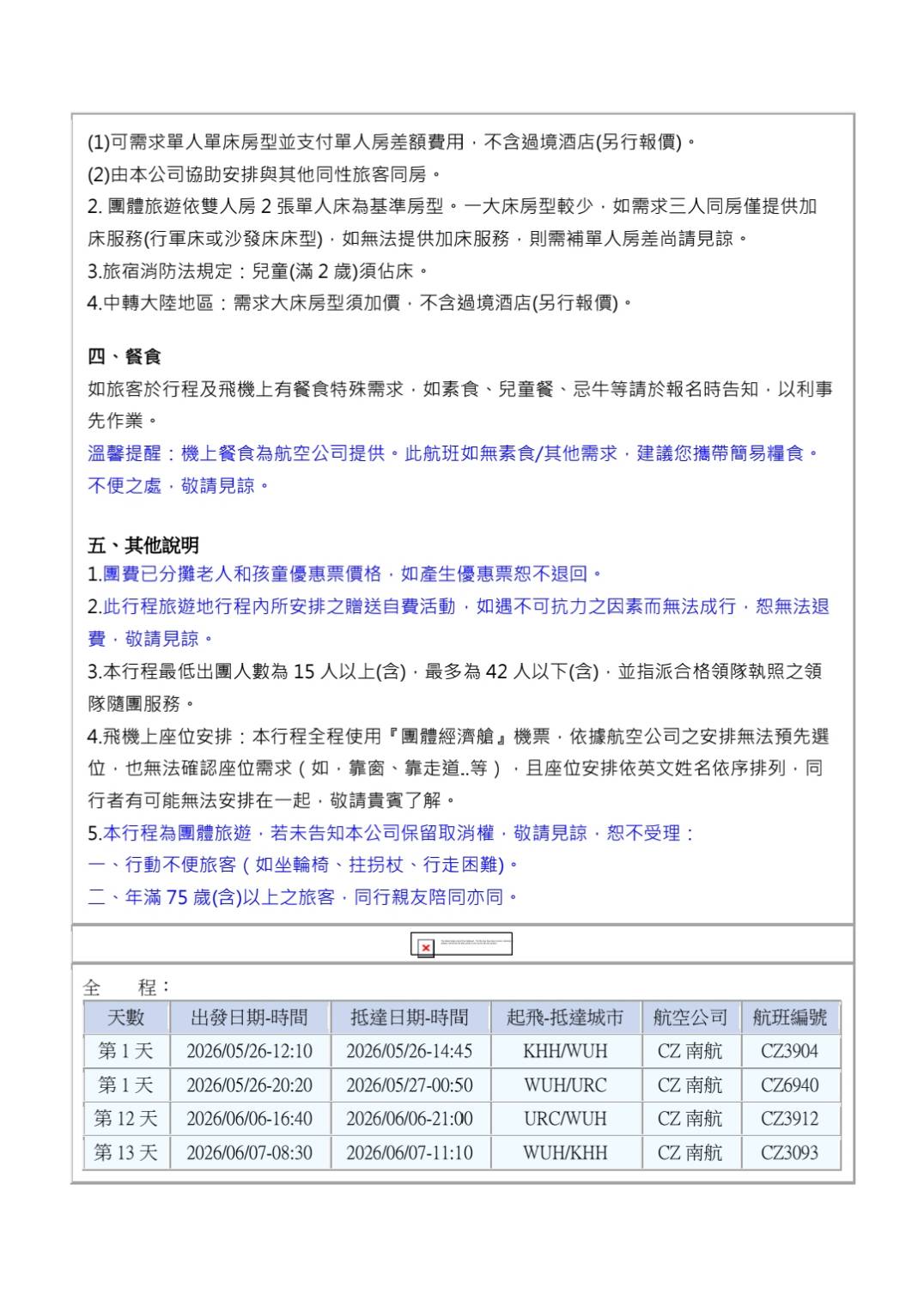 3. 行程如遇觀光景點休假及住宿飯店地點調整或遇不可抗拒之現象(天候不佳),本公司保有變更行程之權利。