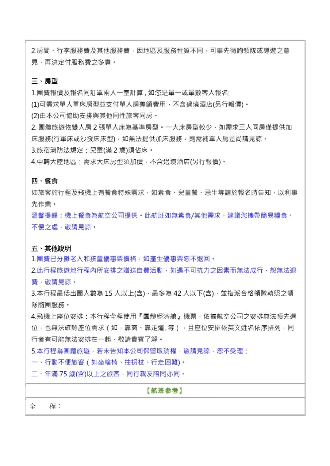 行程班機時間及降落城市與住宿飯店之確認以說明會為主。