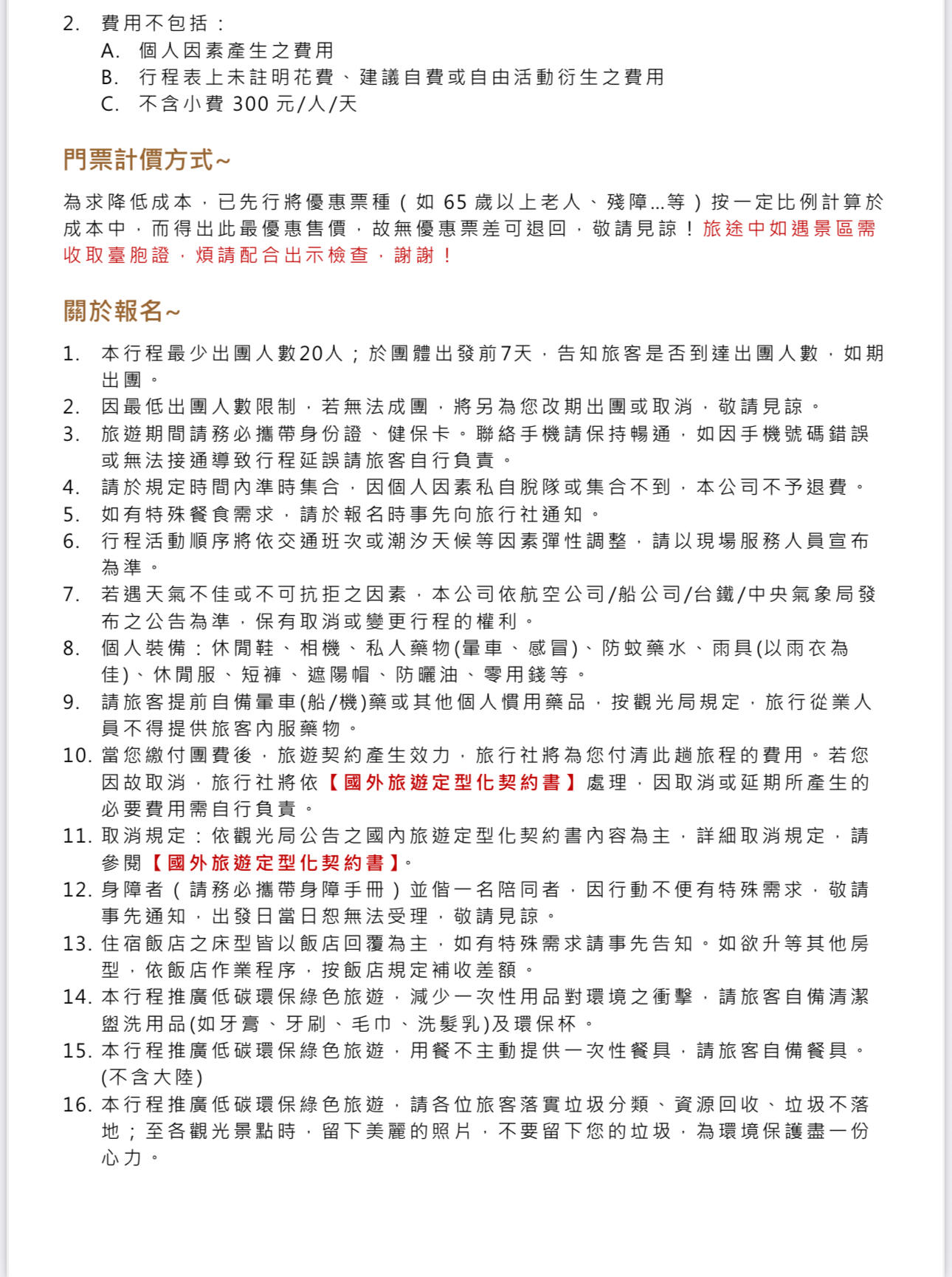 行程如遇觀光景點休假及住宿飯店地點調整或遇不可抗拒之現象(天候不佳),本公司保有變更行程之權利。