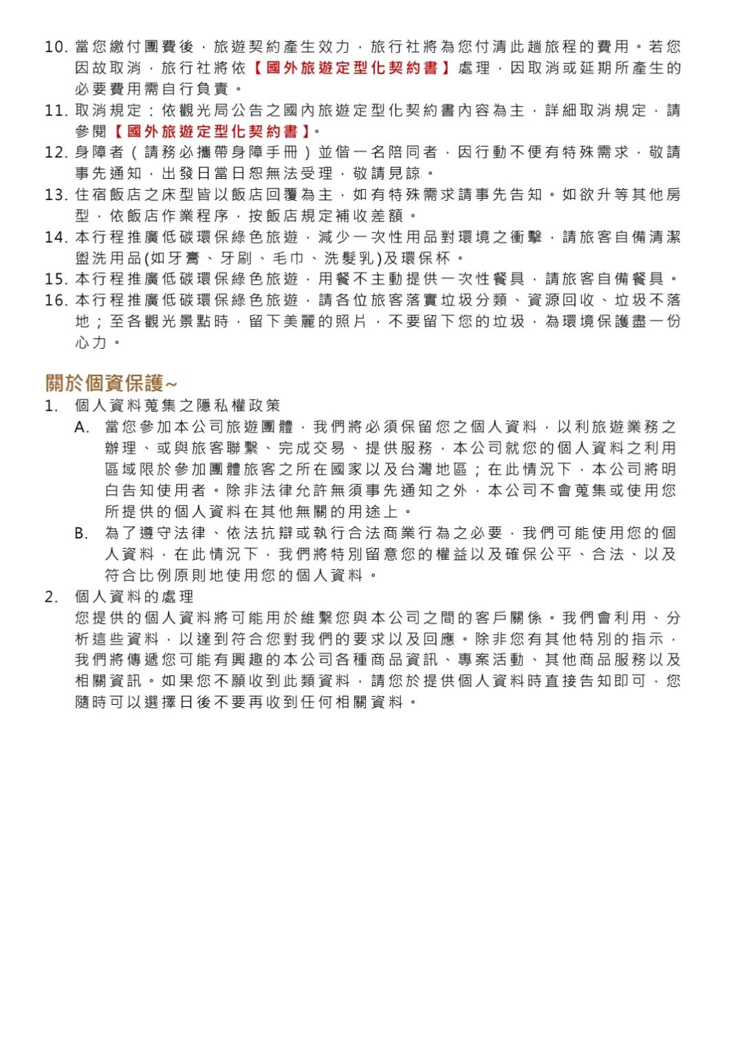 行程如遇觀光景點休假及住宿飯店地點調整或遇不可抗拒之現象(天候不佳),本公司保有變更行程之權利。