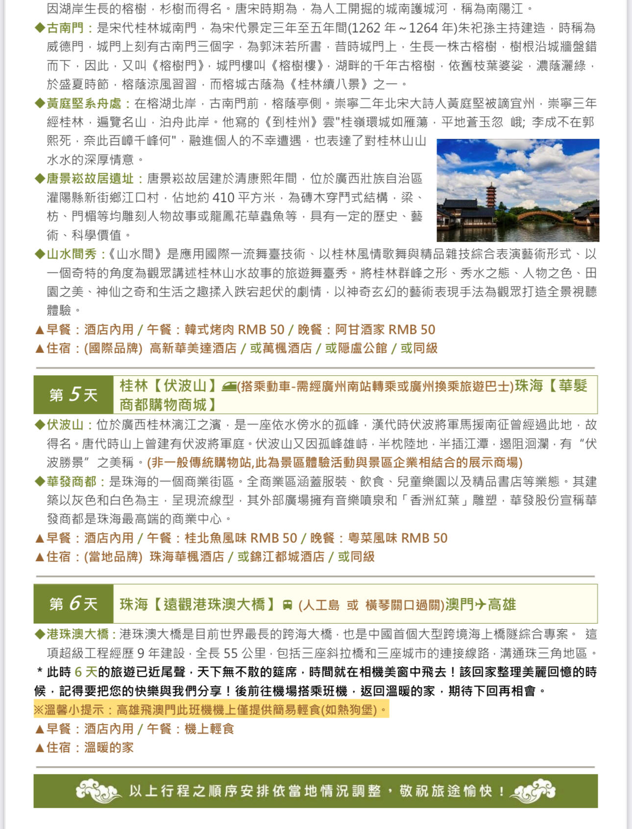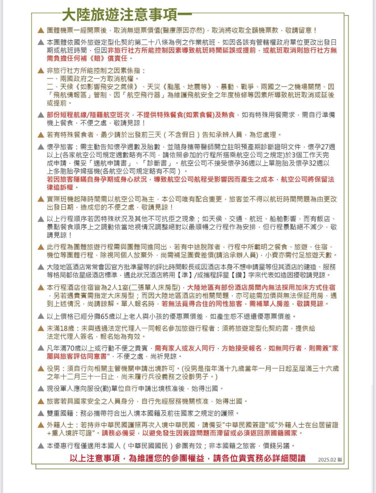 行程如遇觀光景點休假及住宿飯店地點調整或遇不可抗拒之現象(天候不佳),本公司保有變更行程之權利。