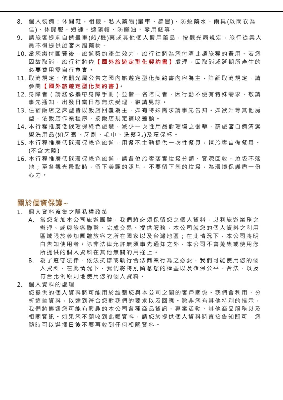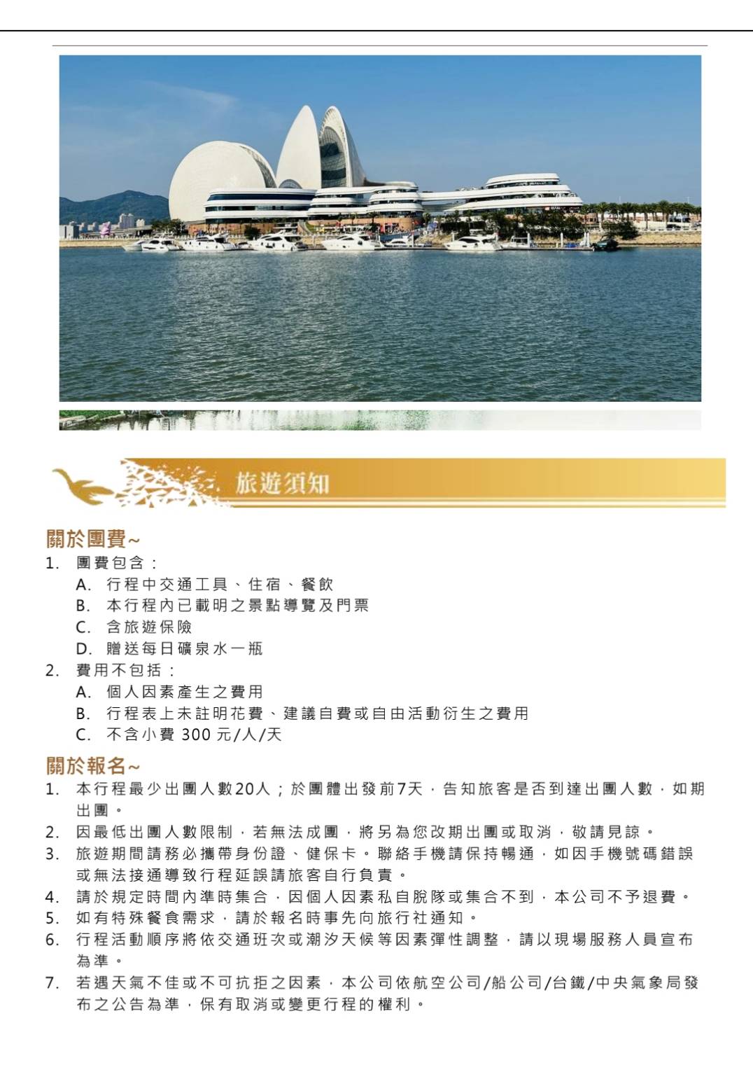 行程如遇觀光景點休假及住宿飯店地點調整或遇不可抗拒之現象(天候不佳),本公司保有變更行程之權利。