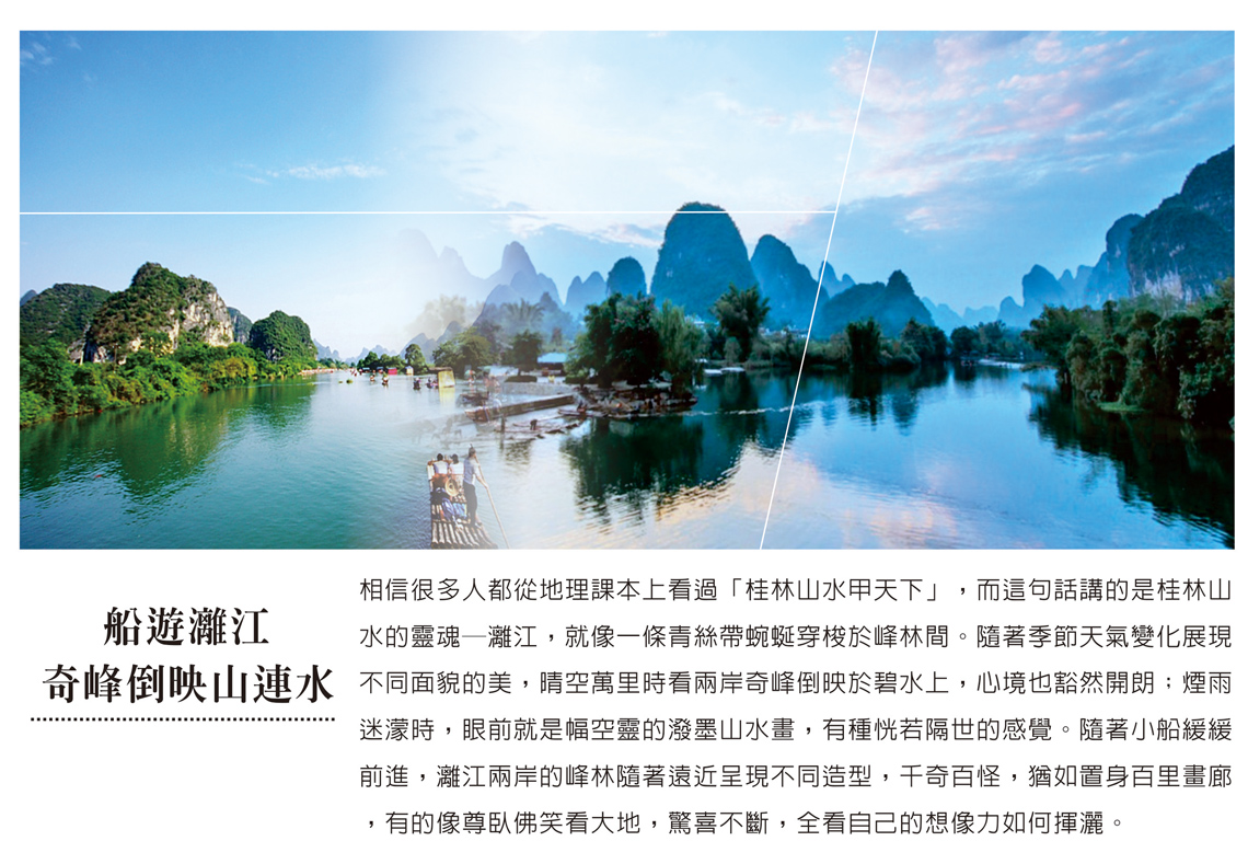 【船遊灕江】興坪碼頭乘船,於船上可觀賞到灕江百里畫廊之中最精華的景色《興坪段》的風光,可觀賞到灕江之上的三處勝景奇觀秀山壁畫、半邊奇渡、張果老倒騎毛驢等,藉以領略《江似青籮帶,山如碧玉簪》的灕江秀麗風光,品味兩岸秀麗山河所勾勒成的山水美卷。