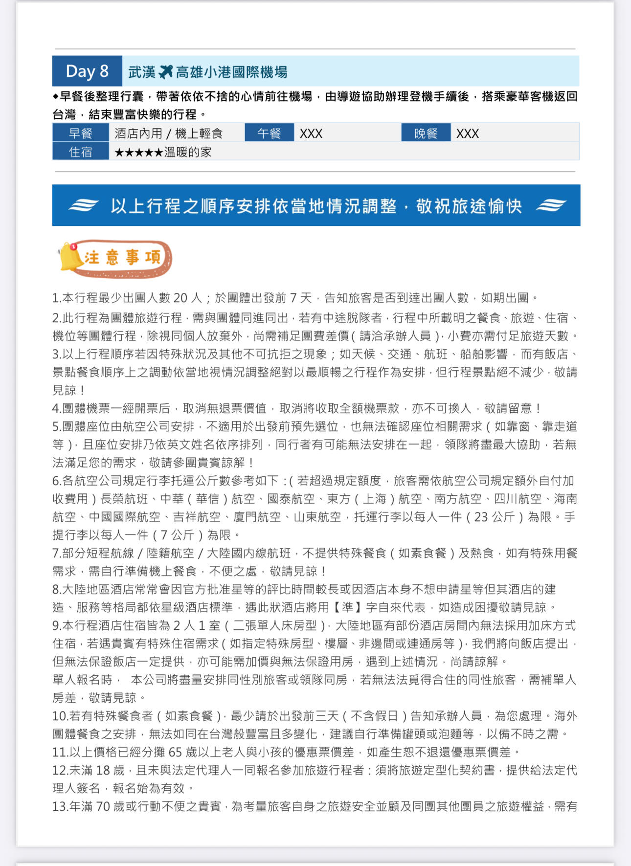 行程如遇觀光景點休假及住宿飯店地點調整或遇不可抗拒之現象(天候不佳),本公司保有變更行程之權利。