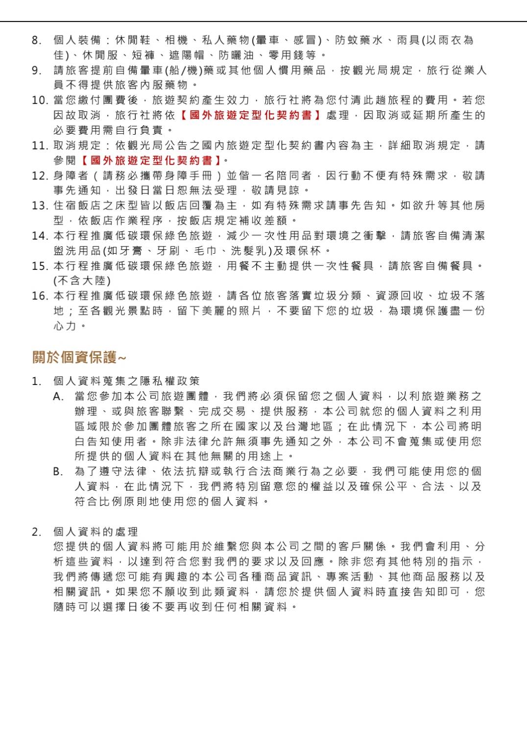 行程如遇觀光景點休假及住宿飯店地點調整或遇不可抗拒之現象(天候不佳),本公司保有變更行程之權利。