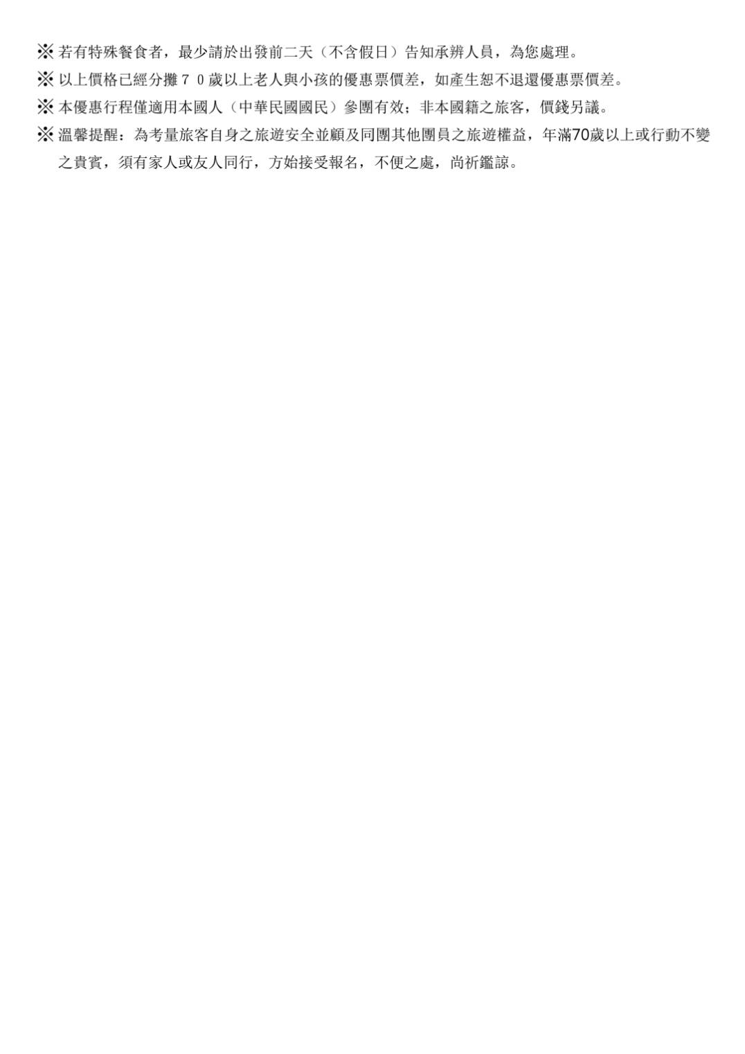 行程如遇觀光景點休假及住宿飯店地點調整或遇不可抗拒之現象(天候不佳),本公司保有變更行程之權利。