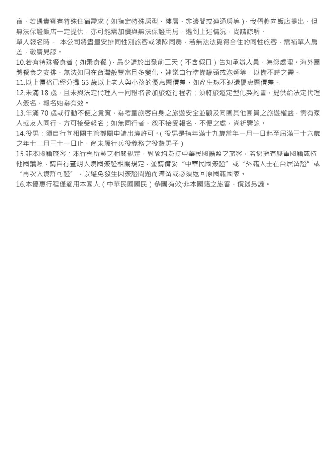 行程如遇觀光景點休假及住宿飯店地點調整或遇不可抗拒之現象(天候不佳),本公司保有變更行程之權利。