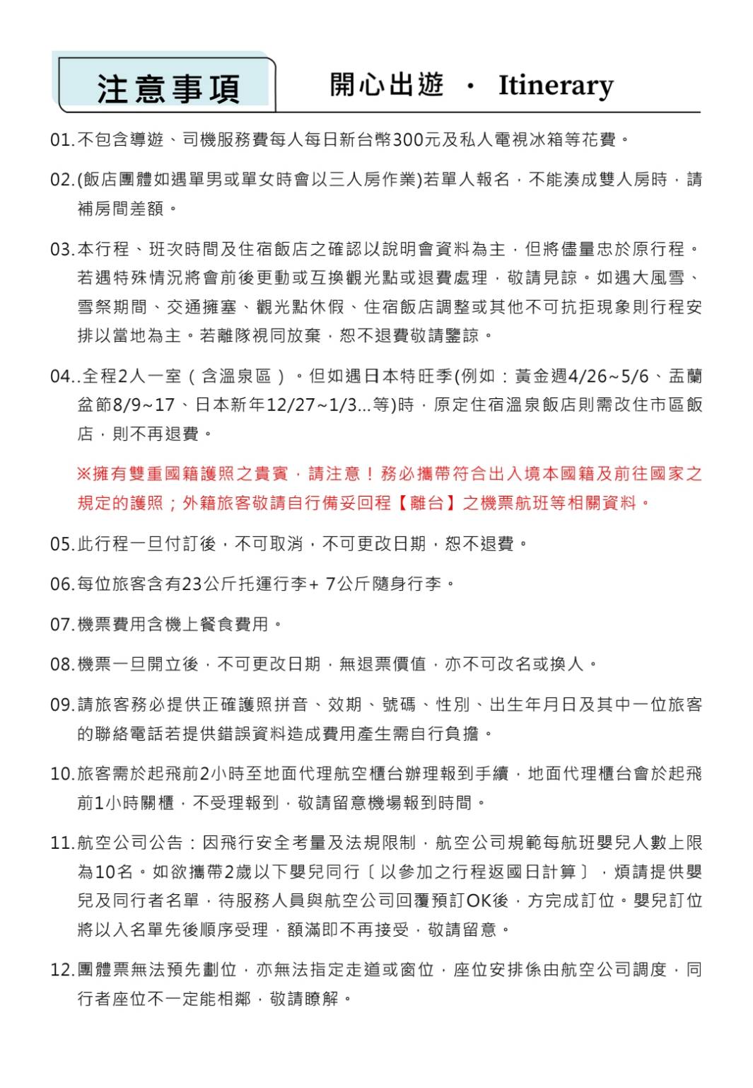 行程如遇觀光景點休假及住宿飯店地點調整或遇不可抗拒之現象(天候不佳),本公司保有變更行程之權利。