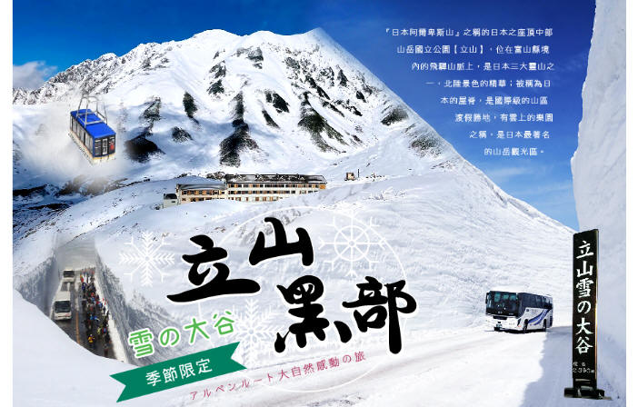 『日本阿爾卑斯山』之稱的日本之座頂中部山岳國立公園【立山】,位在富山縣境內的飛驒山脈上,是日本三大靈山之一,北陸景色的精華;被稱為日本的屋脊,是國際級的山區渡假勝地,有雲上的樂園之稱,是日本最著名的山岳觀光區。因位於海拔二千多公尺,冬季積雪太深無法通車,每年四月下旬至十一月中下旬才可全線行車。