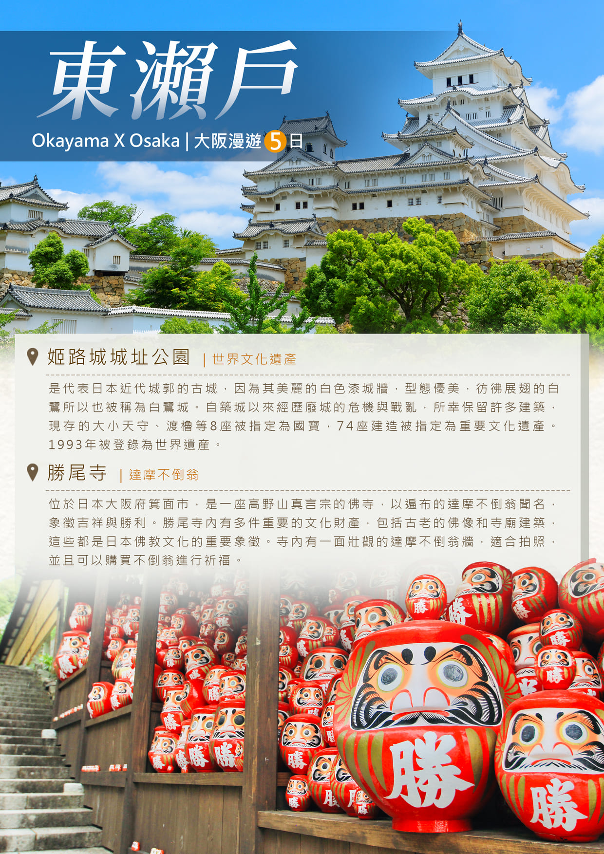 位於日本大阪府箕面市,是一座高野山真言宗的佛寺,以遍布的達摩不倒翁聞名,象徵吉祥與勝利。勝尾寺的歷史可以追溯到公元586年(飛鳥時代),由僧侶「聖德太子」所創建,最初是為了祈求國家和平和繁榮。寺名中的「勝」字象徵著勝利,據說信徒來此祈求勝利與成功,特別是在考試、賽事等方面,勝尾寺內有多件重要的文化財產,包括古老的佛像和寺廟建築,這些都是日本佛教文化的重要象徵。寺內有一面壯觀的達摩不倒翁牆,適合拍照,並且可以購買不倒翁進行祈福。