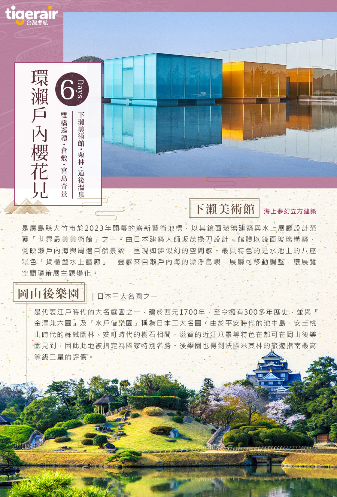 島波海道是於西元2006年4月全線開通的公路,無需使用船隻即可從本州到四國,連接日本廣島縣尾道市和愛媛縣今治市的公路。不僅是在日本國內有名,也是享譽全球的「享受大自治市的公路。不僅是在日本國內有名,也是享譽全球的「享受大自然的自行車旅行景點」。在約70公里長的途中,有6個島嶼,架有8座橋梁。其中多多羅大橋是位於日本瀨戶內海的斜拉橋,連接廣島縣尾道市的生口島及愛媛縣今治市的大三島之間。來島海峽大橋位於愛媛縣東北部的今治市,建於1999年,是世界上第一座三聯式吊橋。來島海峽大橋是西瀨戶自動車道(連結廣島縣和愛媛縣的高速公路,全長達60公里)中最大的一座橋,全長達4105公尺的大橋由三座橋組成,自北向南分別是長960公尺的第一大橋、長1515公尺的第二大橋、長1570公尺的第三大橋。高聳入雲的6座塔架、呈現優美弧線的懸索,都向遊客們展現著大橋之美。