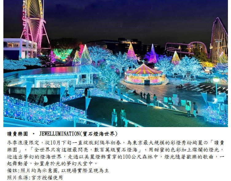 浪漫限定於「讀賣樂園」裡的冬季「亮點」十足,重頭戲就是美麗燦爛的燈飾,從秋天一直綻放到隔年2月中旬,預定時間(16:00~20:30)夜晚。是一場用寶石色彩燈打造的燈光演繹。「全世界只有這裡最閃亮,500萬寶石燈海」,每一年有不一樣主題,用甜蜜的色彩加上燦爛的燈光,迎造出夢幻的燈海世界。除了欣賞璀璨之美外,樂園中還有許多刺激好玩的遊樂設施,如有時間,您可自費嚐試體驗喔!!