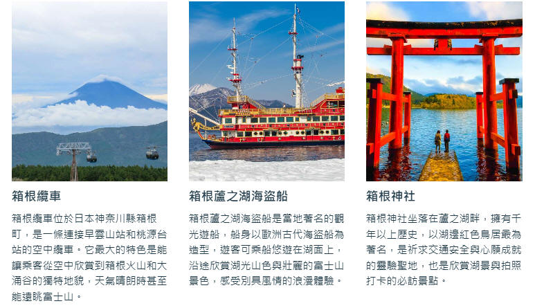 箱根海盜船是箱根蘆之湖的熱門觀光船,能在船上同時欣賞到壯觀的大鳥居、富士山和蘆之湖美景。在晴朗的日子裡,湖面波光粼粼,藍天映襯下的景色更是令人嘆為觀止。箱根海盜船共有三艘不同風格的觀光船:Royal