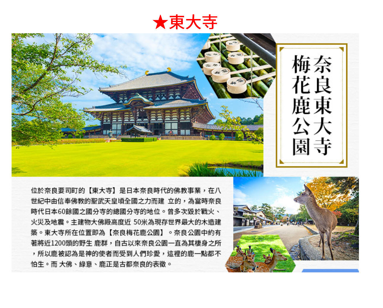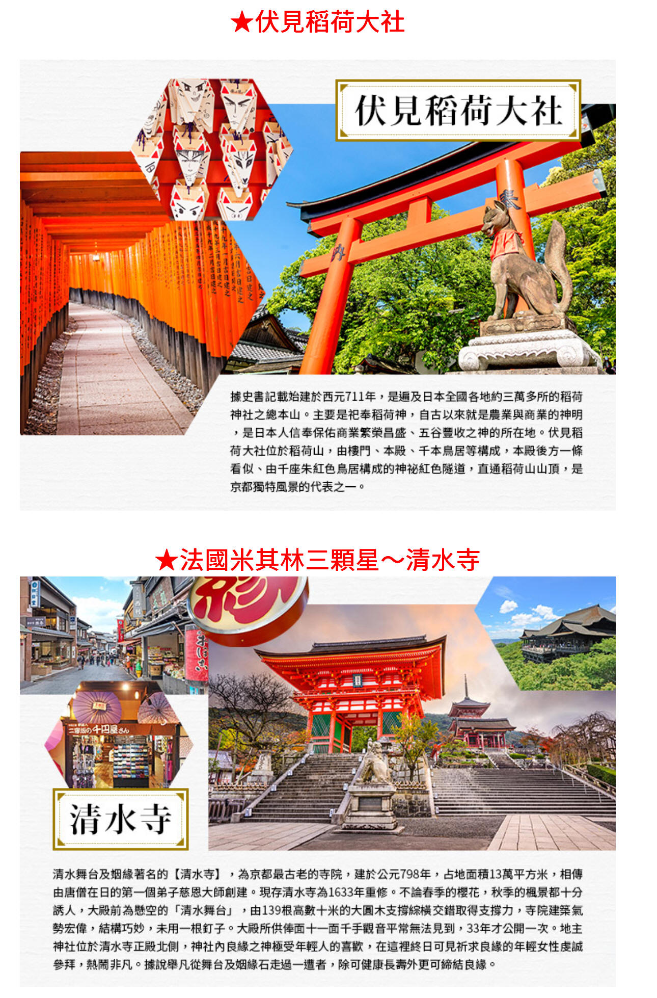 擁有悠久歷史的清水寺,位處京都的音羽山,寺院依地勢築建,占地遼闊,受自然景觀所包覆,寺門、堂院、塔樓掩映其中。清水寺主要建築為供奉著千手觀音的本堂,本堂前有處以檜木搭成的「舞台」,它只由139根高數十米的大圓木支撐,未用一根釘子建成,巧妙地聳立於陡峭懸崖上,時常出現於日本歷史與俗語中,是清水寺內最具代表性的代表風景。【地主神社】位於清水寺正殿北側,神社內良緣之神極受年輕人的喜歡,在這裡終日可見祈求良緣的年輕女性虔誠參拜,熱鬧非凡。據說舉凡從舞台及姻緣石走過一遭者,除可健康長壽外更可締結良緣。二、三年坂步道兩旁皆京味小舖,沿途有許多店家販售著京都名產生八橋等紀念品及手工小物,在此自由購物您可深刻體會京都古味風鎮。