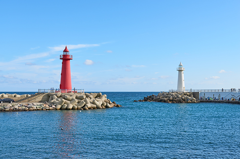 矗立在港邊的沿岸走可以看到兩座燈塔,紅色、白色還有大海與天空的兩種藍色,這樣的畫面好舒服好美。藍色的天加上白色的燈塔感覺多了分素雅白淨感,很漂亮,白色燈塔這的牆面則有許多壁畫裝飾。粉嫩的色系,搭配上淡淡的藍天背景,覺得特別可愛。
