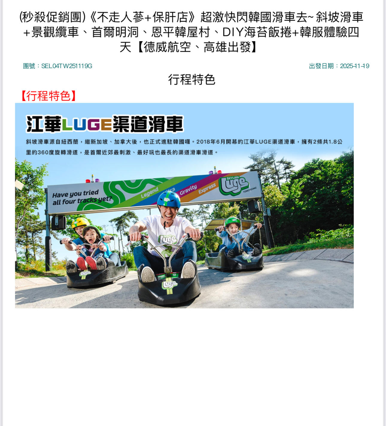 斜坡滑車源自紐西蘭,繼新加坡、加拿大後,也正式進駐韓國囉。2018年6月開幕的江華LUGE渠道滑車,擁有2條共1.8公里的360度旋轉滑道,是首爾近郊最刺激、最好玩也最長的渠道滑車滑道。