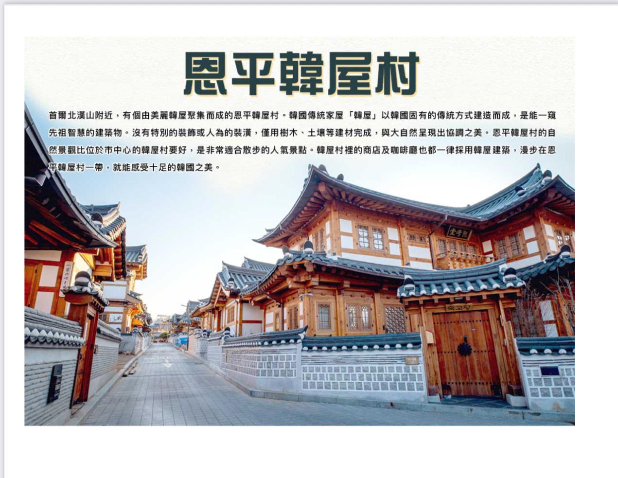 恩平韓屋村建於2014年,是首都圈附近規模最大的韓屋建築用地。這裡的韓屋全是新建的,可見許多傳統茶屋跟甜點。