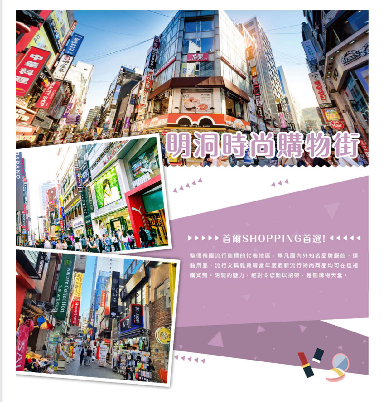 整個韓國流行指標的代表地區,舉凡國內外知名品牌服飾、運動用品、流行文具雜貨等當年度最新流行時尚商品均可在這裡購買到。明洞的魅力,絕對令您難以招架,是個購物天堂。