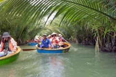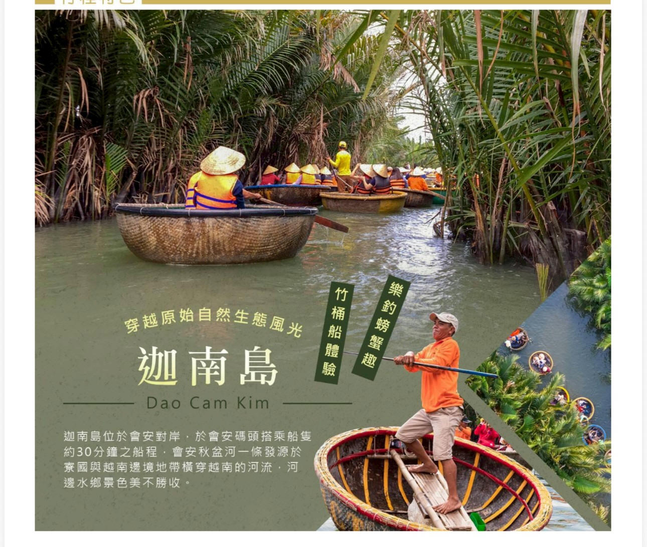 迦南島地處會安秋盆河流域,是秋盆河的明珠島,以島嶼間的水椰林及自然原生態聞名;由碼頭乘坐擺渡船前往迦南島,特色大船廟、千年沉香井、簸箕船…體現別樹一幟的地方風情,還能欣賞到村民表演特有的簸箕船雜技!