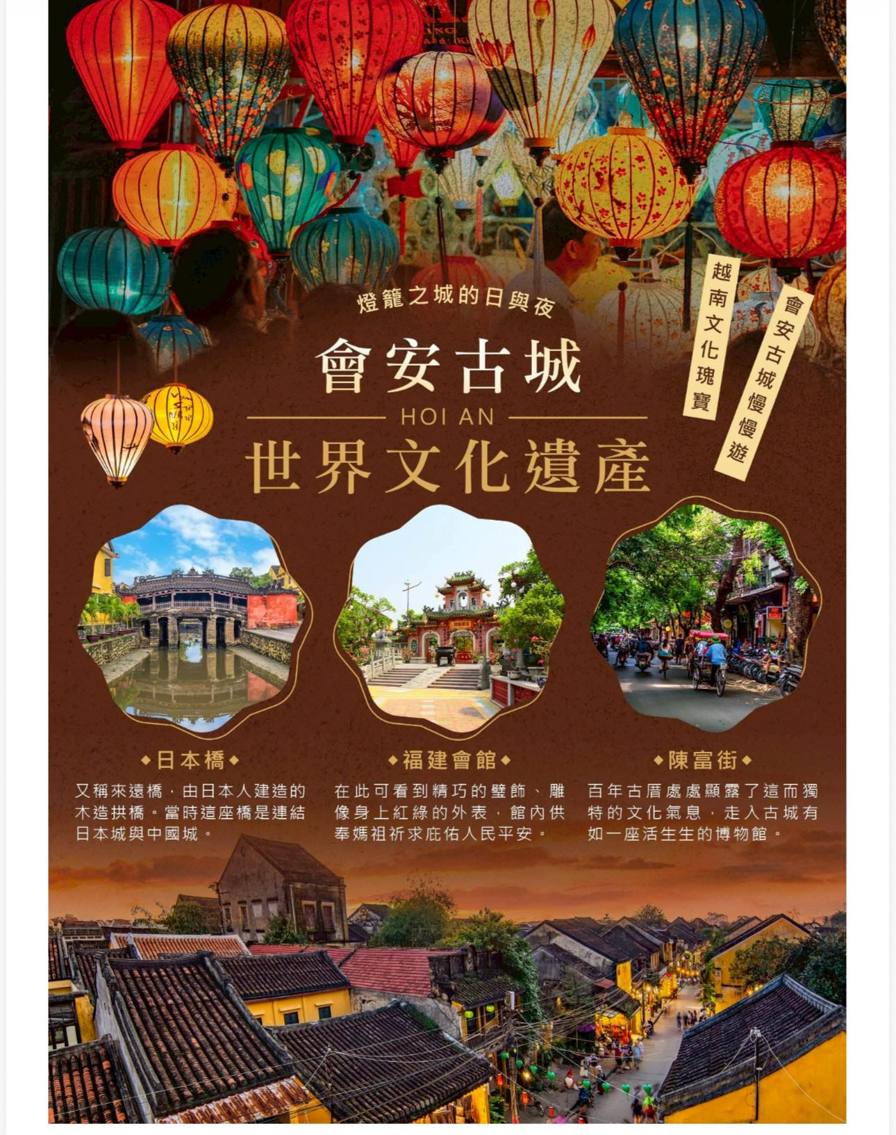 會安古城的建築型式,融合了越南文化及異國風格,到了夜晚幾乎家家戶戶都掛上燈龍,漫遊其中能感受他獨有的風情及魅力。1999年被聯合國教育科學文化組織列為世界遺產,並且是現今保存最好的15~19世紀東南亞經貿城市典範。