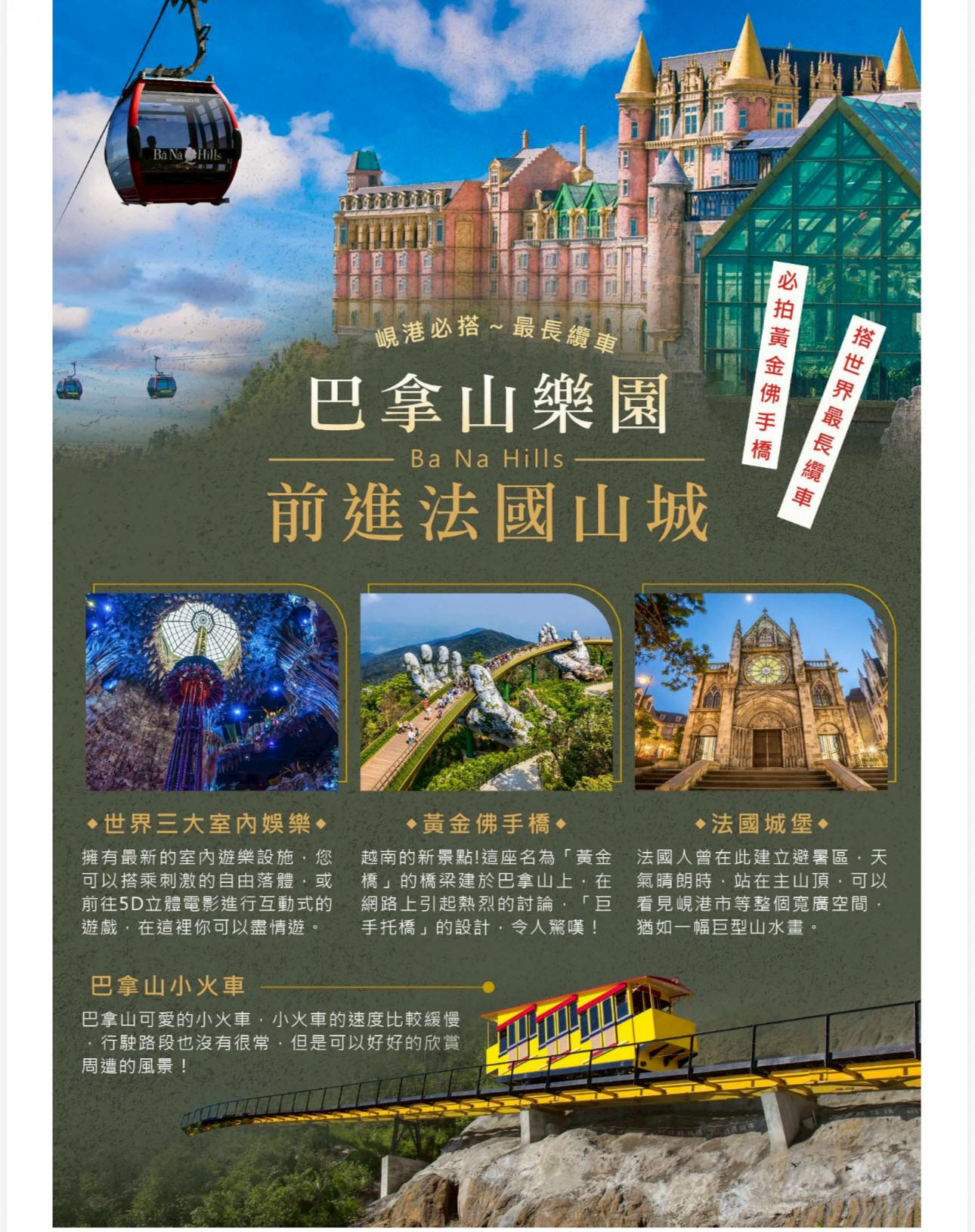 峴港知名景點《巴拿山》,位在海拔1,487公尺的高山,年均溫在15~20度,是法國殖民時期王公貴族的避暑勝地,建築風格以法式城堡及街道為主,設置纜車、小火車、花園、酒莊及樂園等設施,因此有「小法國仙境」之稱。