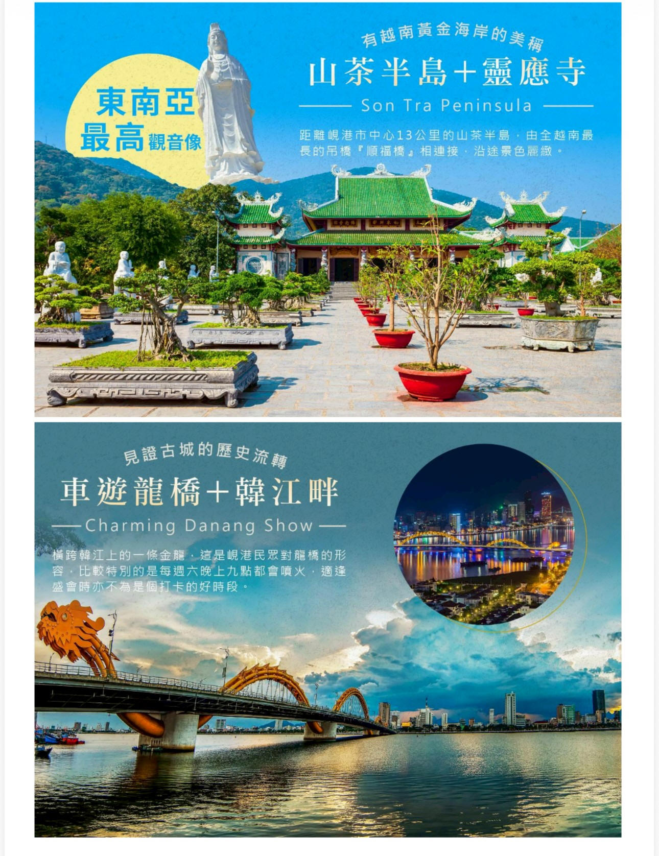 山茶半島最佳鳥瞰整座峴港市的地點,沿途景有蘊鬱山景也有蔚藍海景。其中山茶半島以一座巨大觀音塑像引人耳目,高約70公尺,高20層樓,是東南亞最高的觀音像。從美溪沙灘即可看到東北方山茶半島上,高聳矗立著純白色的觀音像。