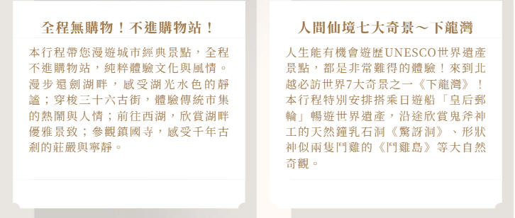 本行程無安排進購物站或土產店,享有更充足之旅遊觀光時間!貴賓們別忘了可以跟您的導遊購買越南土特產,例如:芒果乾、糖果、腰果、咖啡.....等等。
