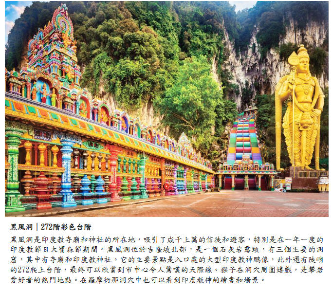 【黑風洞彩虹階梯】最新IG打卡景點:洞深十哩,蜿蜒崎嶇,驚險刺激,感受一下異國神秘宗教的洗禮,欲登上黑風洞,得先攀登272層階梯才可抵達,洞內有一印度神殿,是印度教大寶森節慶祝活動的重鎮,洞內成群的猴子及蝙蝠,洞內還有一個高達100公尺的寺廟透天洞,偶有陽光斜線而入,呈現出奇詭莊嚴的氣氛。
