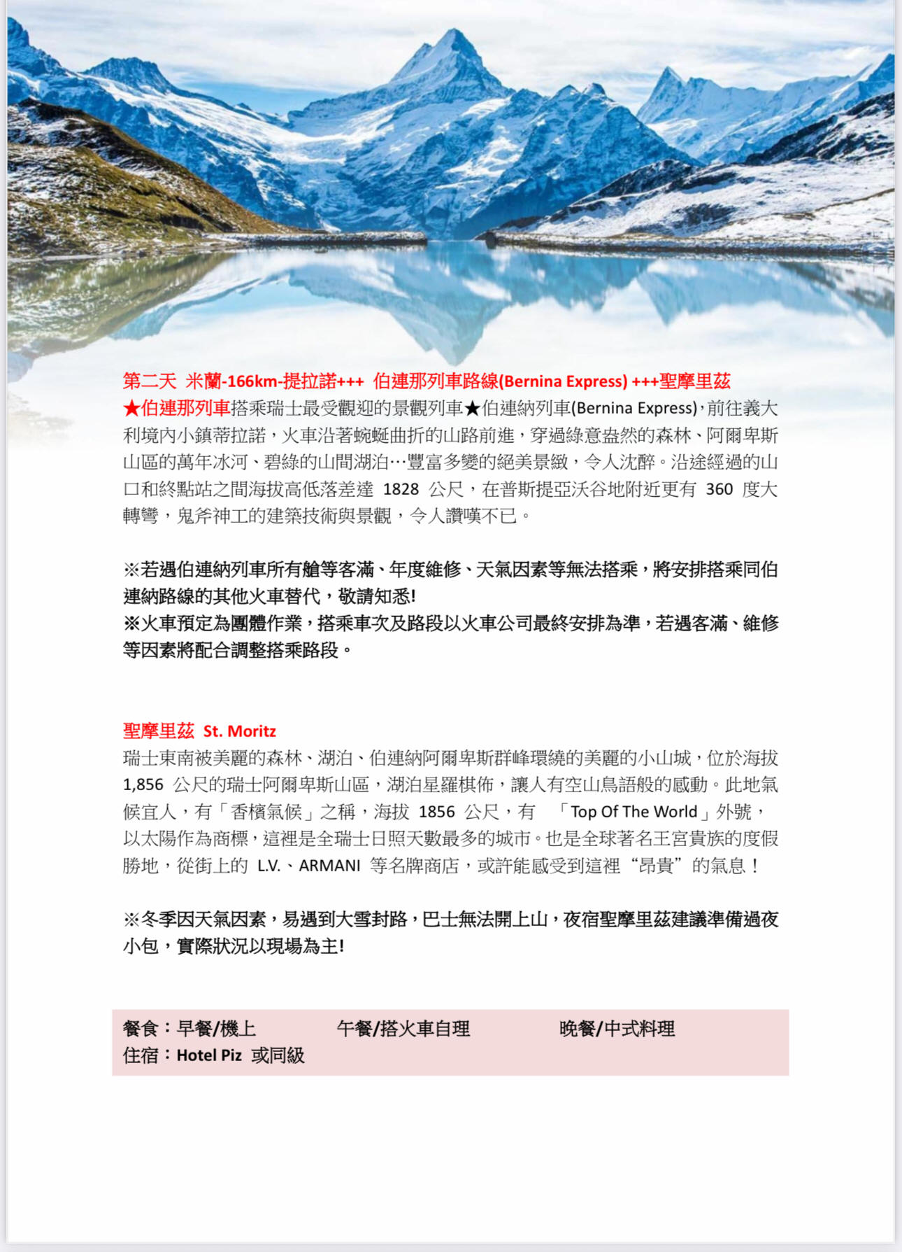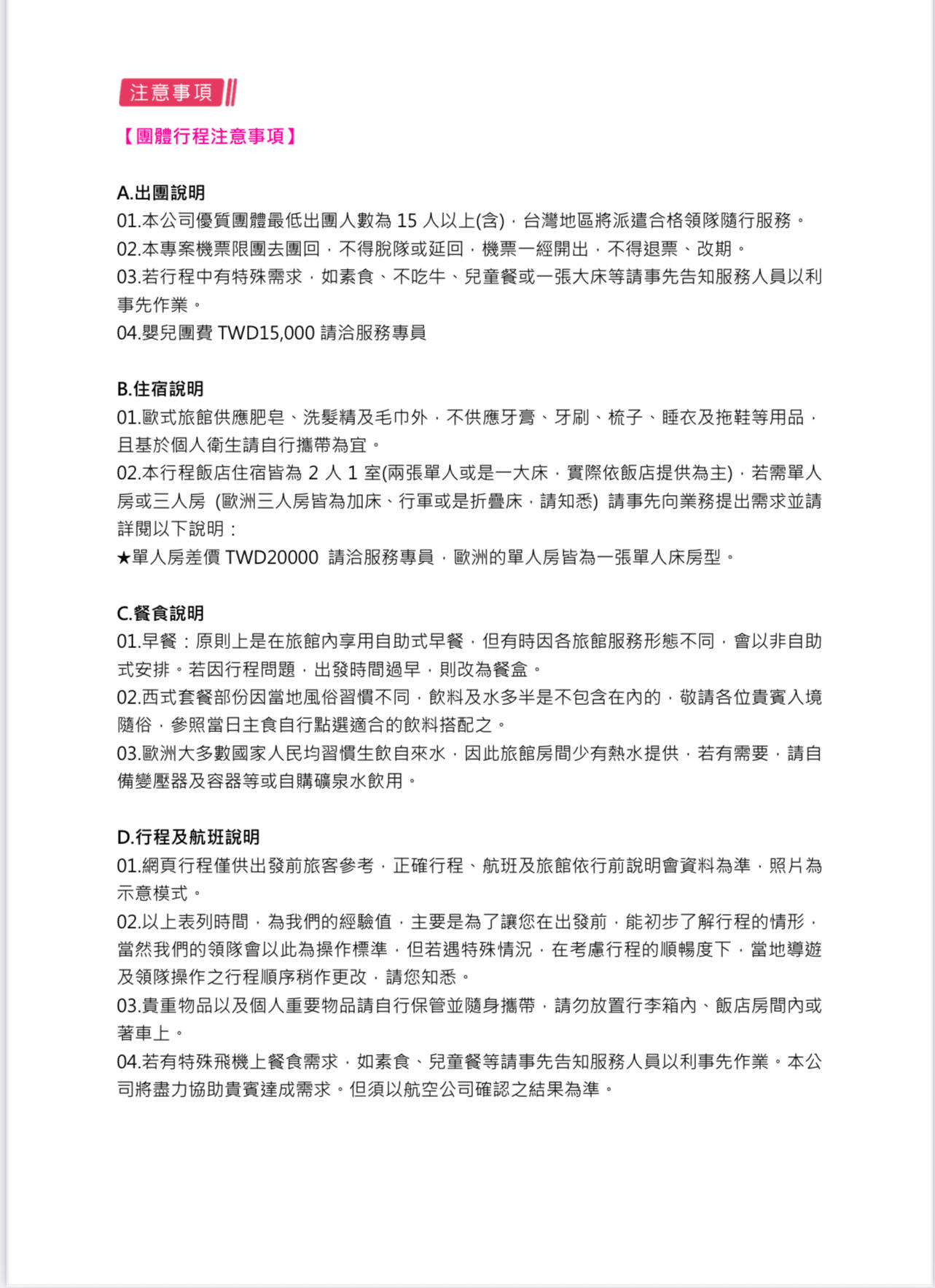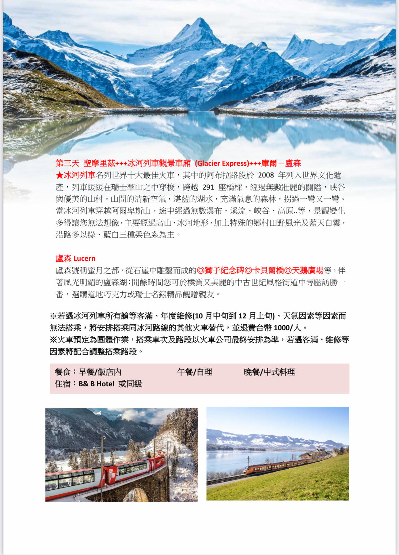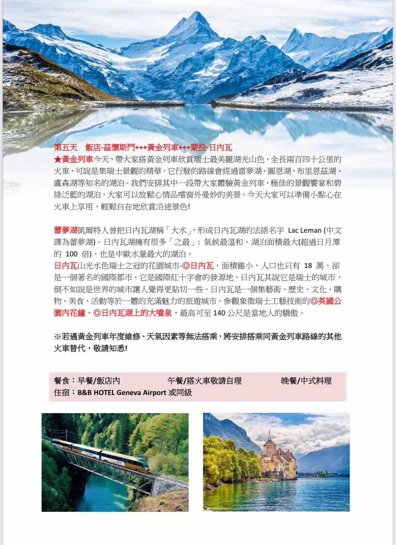 行程如遇觀光景點休假及住宿飯店地點調整或遇不可抗拒之現象(天候不佳),本公司保有變更行程之權利。