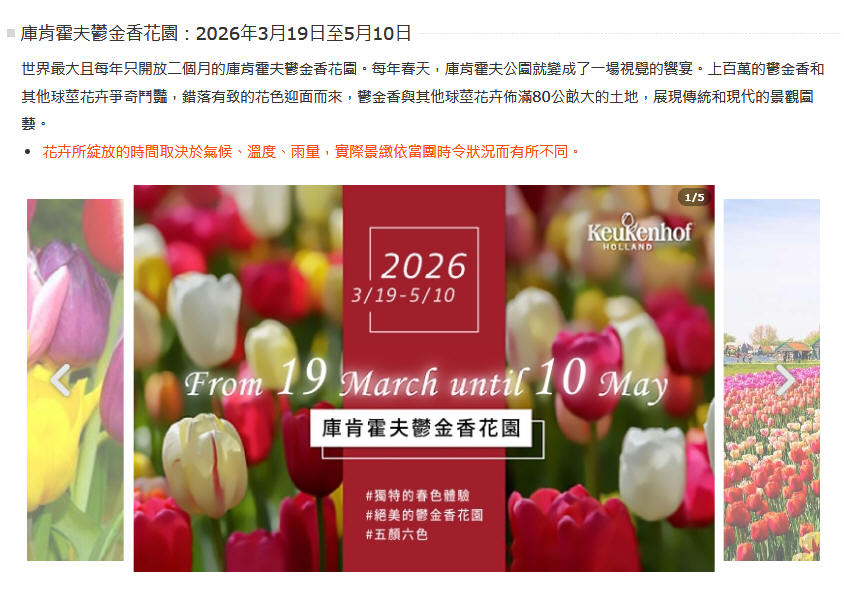 2. 以上為庫肯霍夫花園官網公告之訊息,如有任何更新資訊,概以官網公告為主。由於植物生長無法強行以人為方式左右,行程中如未能及時更正,敬請見諒。
